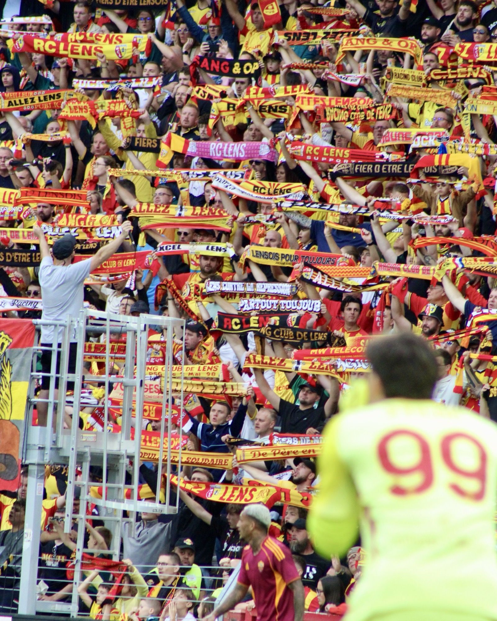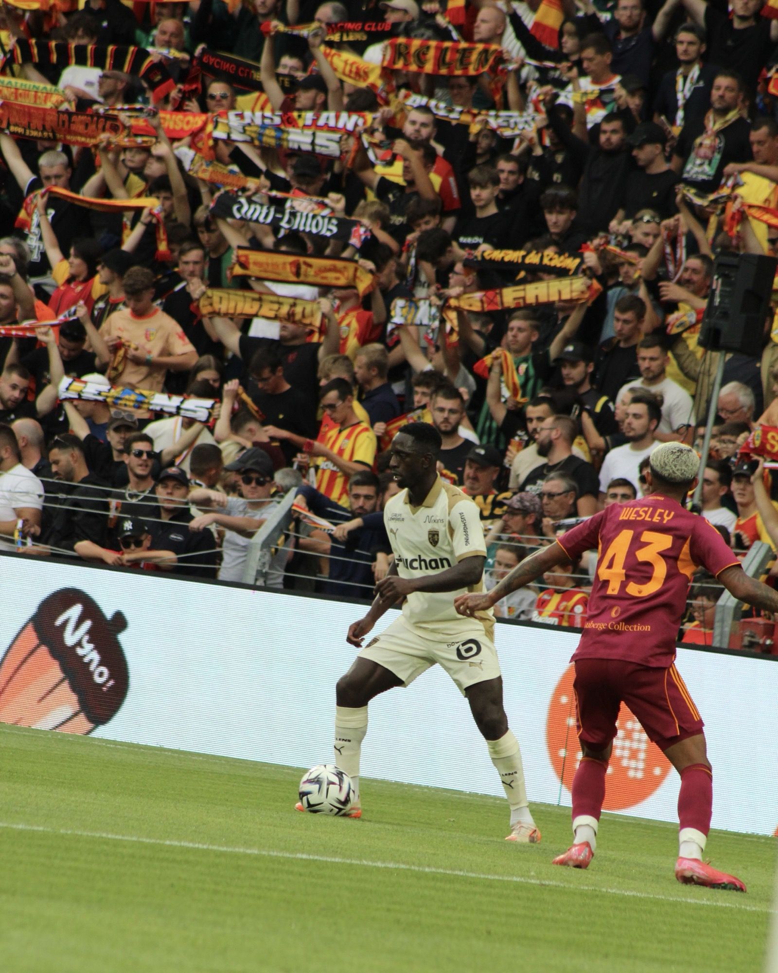 The debut on the field of the new Third jersey took place during the friendly match played last Saturday against Roma at the Bollaert-Delelis stadium, a facility inaugurated in 1933 with 38,223 seats that recalls a British aesthetic due to the four double-ring stands completely independent of each other. Reminding us that we are in the deep north of France, besides the harsh weather, is the motto Fier d'être lensois displayed in every corner of the stadium. Thousands of fans read it as they fill the stands despite it being the first weekend of August, and to take their seats they pass through the new fan zones designed by the club to improve the experience. The pride of being Lensois visually translates into the logos of miner’s pickaxes and lanterns used to light the mines decorating the newly renovated locker rooms, or the all-black design of the tunnel walls leading to the playing field, reminiscent of coal. These renovations were completed by the club this summer after finalizing the purchase of the stadium property in May 2025. Because it’s the little things that make Lens special.