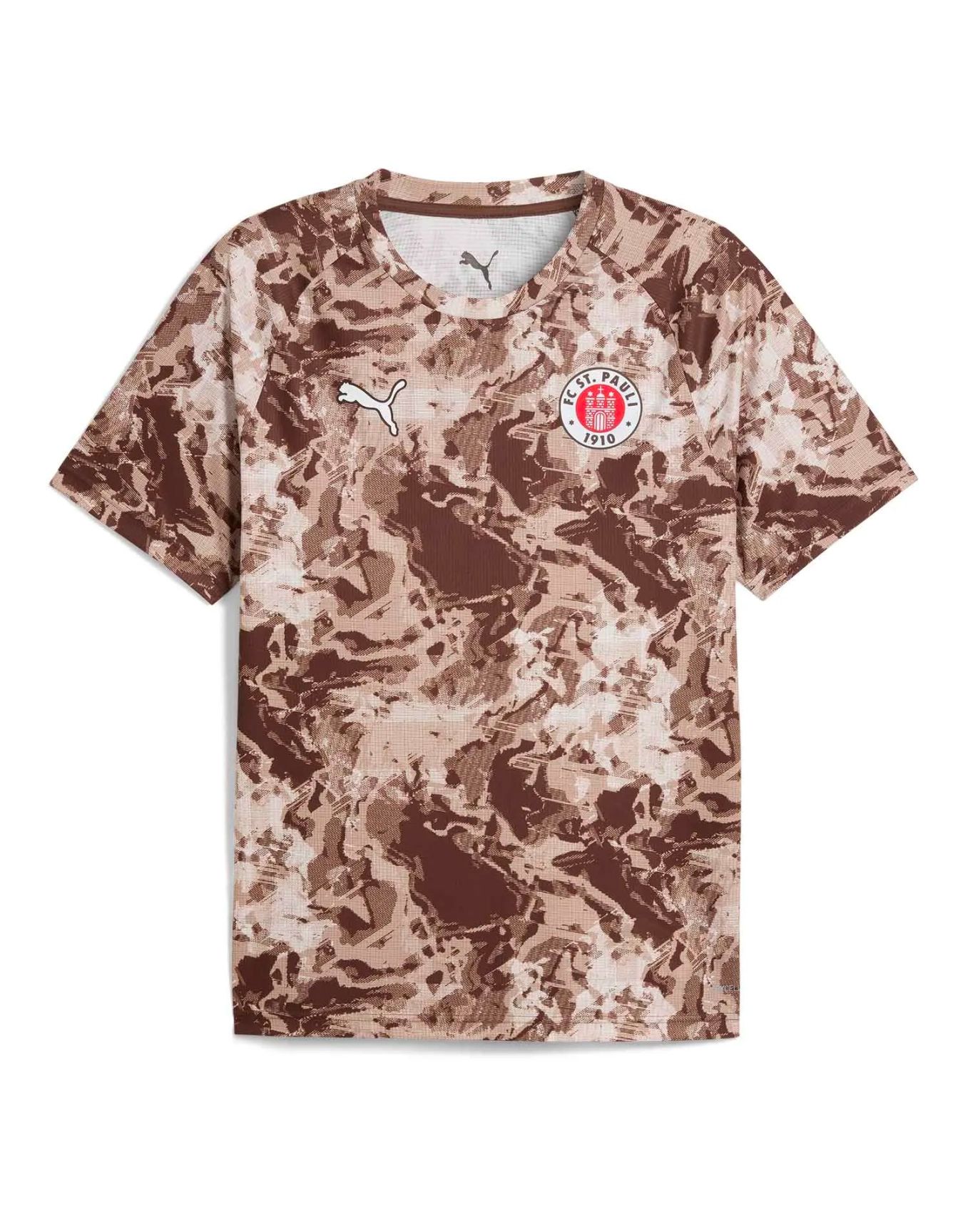 Small black tiles repeated regularly across the entire front: that’s the pattern designed by PUMA for Borussia Dortmund, while for St. Pauli the German brand chose a different solution, focusing on a camouflage effect with different shades of brown. These are the two best prematch shirts of the German league along with adidas’ shirt for Bayern Munich: an abstract pattern where various shades of red, black, and blue overlap. The result is an irregular design featuring brush strokes filled with tiny horizontal lines for a contemporary touch.