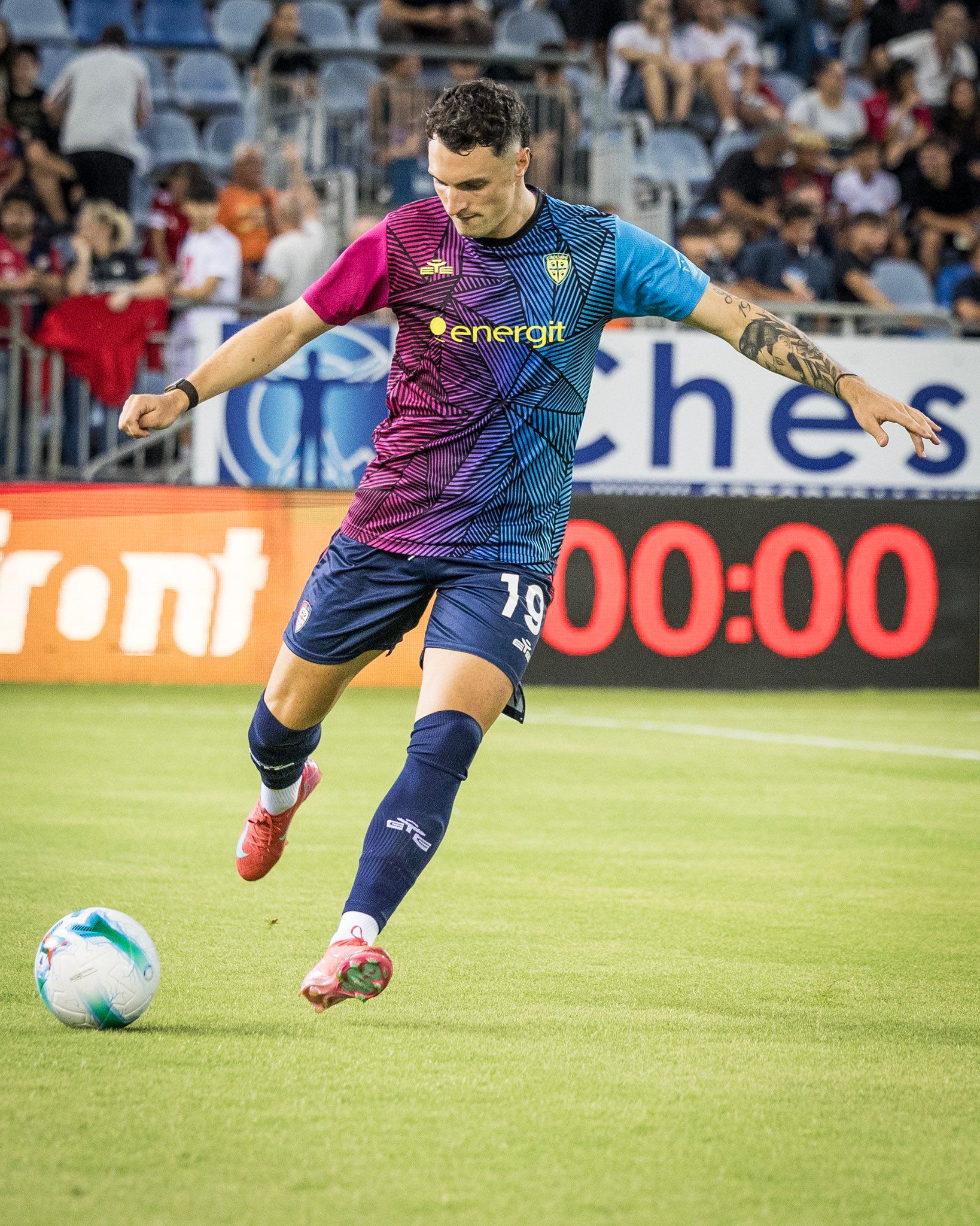 Of course, Serie A doesn’t shy away from the geometric pattern trend, with two examples: one expected and one surprising. The expected one is the black shirt with orange lightning bolts that adidas created for Roma. The surprising one is EYE Sport’s work for Cagliari, a spiderweb of black triangles filled with vertical or horizontal black bars covering a two-tone shirt where the red of the right side gradually fades into the blue of the left side.