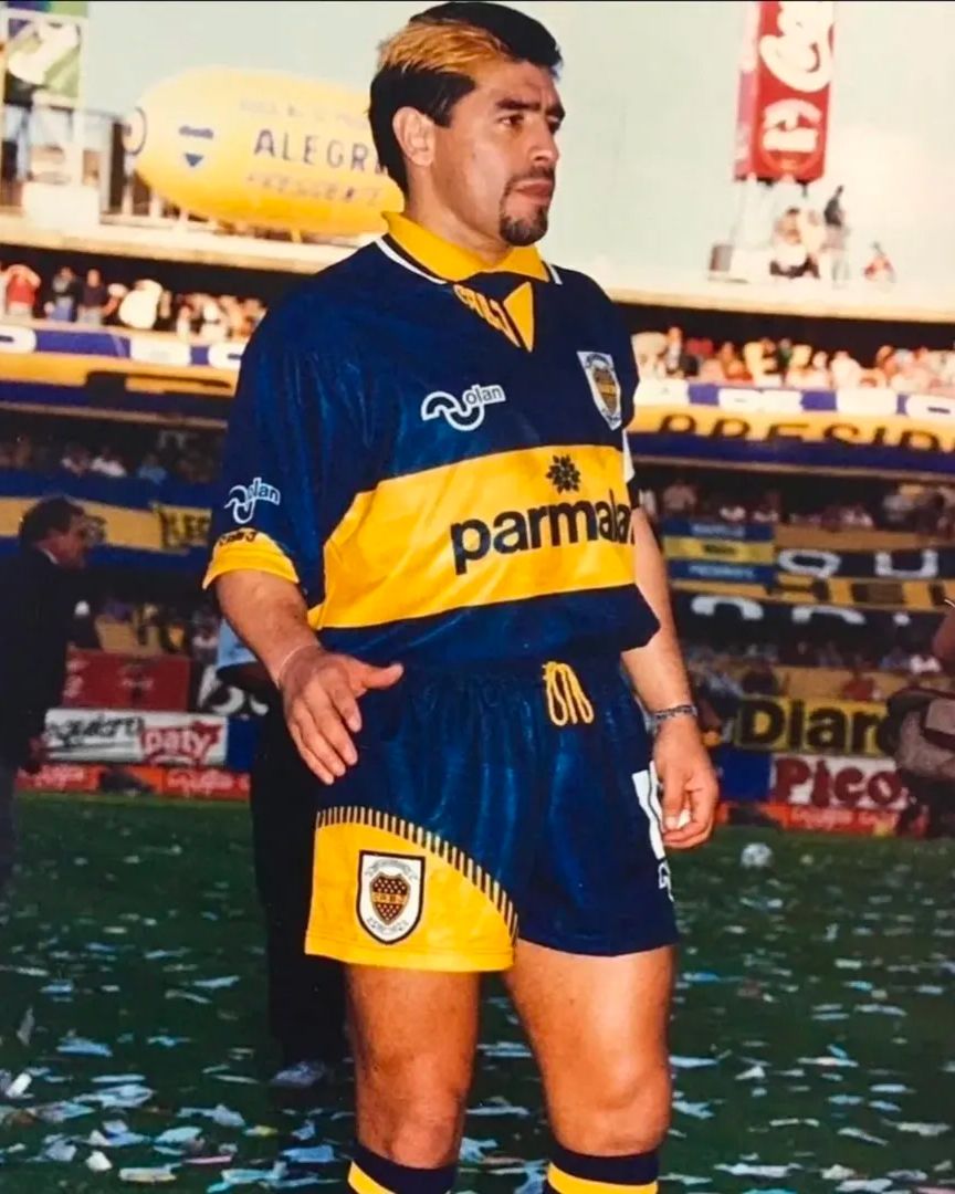 That blonde streak perfectly matched the horizontal yellow band on a blue background that has always been synonymous with Boca Juniors, a template born by chance. Forced to abandon the white vertically striped jersey due to a lost match against Nottingham de Almagro, the Boca Juniors members in 1906 drew inspiration from the flag of Sweden that was flying on the Drottning Sophia, one of the boats docked at the port of La Boca, the Buenos Aires neighborhood where the club was founded by a group of Italian immigrants from Genoa. Thus was born the legend of Azul y oro of Boca Juniors, one of the most famous and significant color compositions in the football world. So strong and impactful that it even influenced the aesthetics of the greatest footballer of all time.