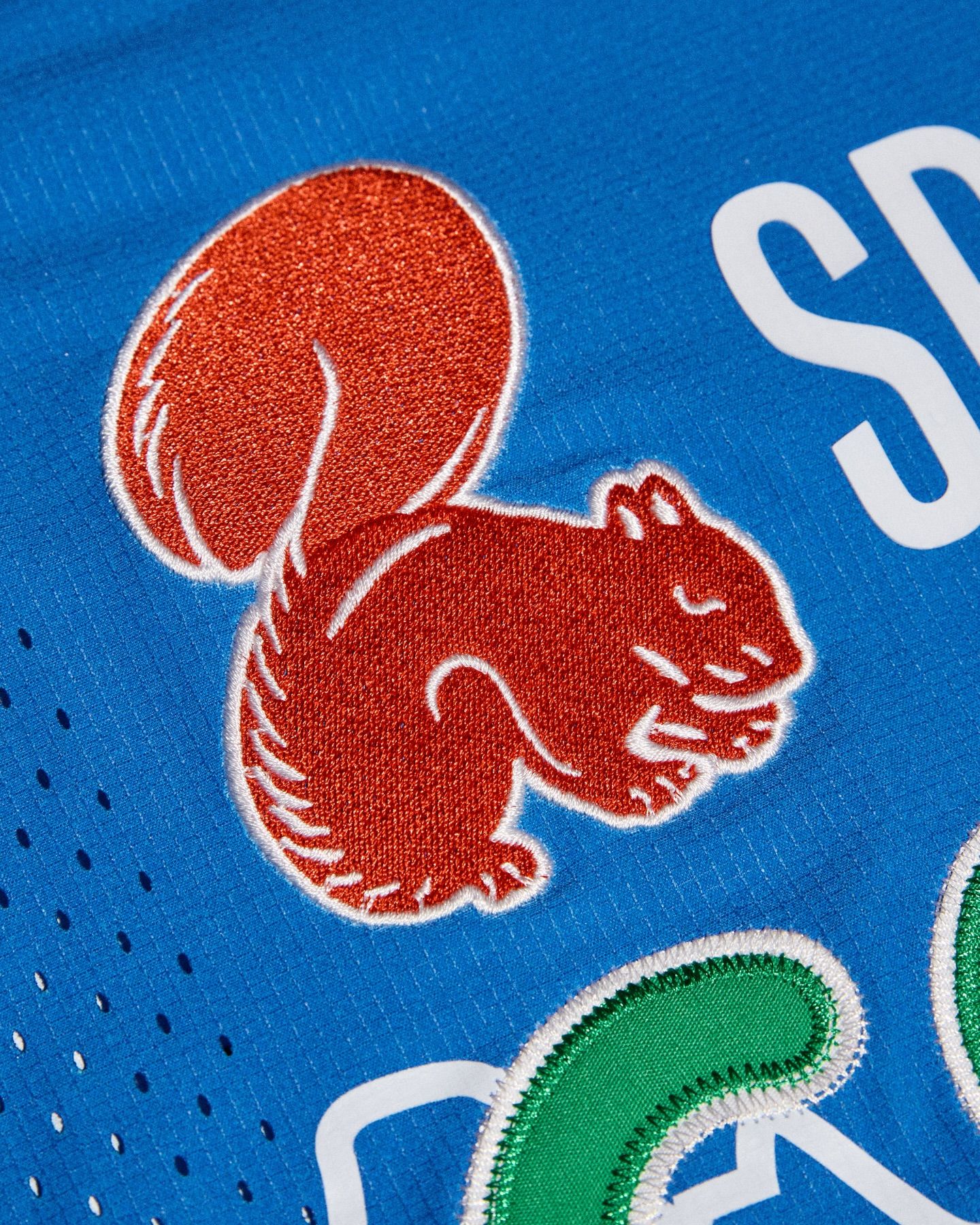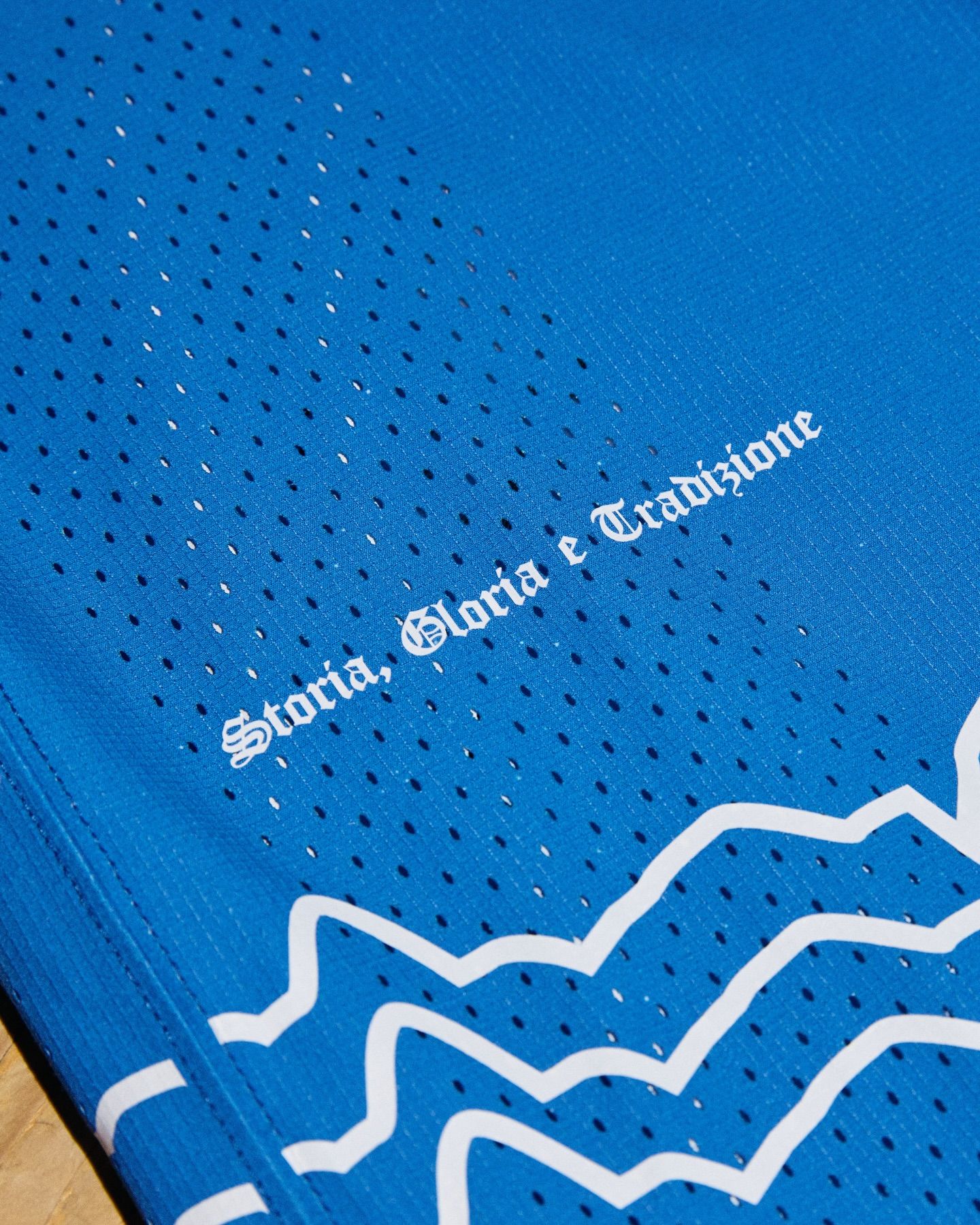 The font is characterized by angular and decisive shapes yet seen through a modern lens. The shade of orange used gives the jersey a vibrant note, an energetic accent that brightens the overall design without weighing it down. On the front, meanwhile, the numbers are stitched using traditional techniques, as are all applied logos, confirming the artisanal attention and the desire to embellish the uniform with tangible details. Completing the garment, along the side there is an insert inspired by the ventilated design of holey t-shirts, now prominent in the running world. This technical detail is not merely an aesthetic element: it improves breathability and introduces a language closer to performance-wear, creating a bridge between two sporting universes that at first glance seem distant.
