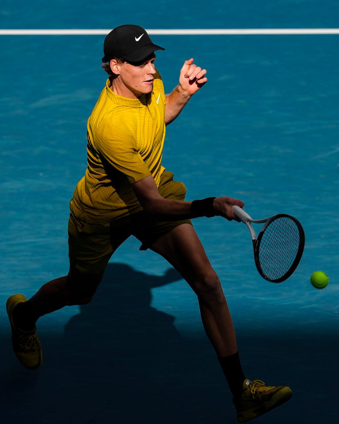 Nike has also pushed hard on vibrant colourways. Carlos Alcaraz took to the court in his signature sleeveless top, split diagonally between a black triangle and a larger mint-green panel, echoed in his sneakers. Orange makes a strong comeback in Swoosh-branded collections as well, as seen in the kit worn by Aryna Sabalenka, where a fluorescent central stripe lights up a black-and-pink bodysuit with light-blue accents. Bold shades also define Mirra Andreeva’s look, built around alternating pale yellows and greens. All eyes are now on Jannik Sinner, who wore a muted mustard-coloured kit during his exhibition match against Félix Auger-Aliassime — a complete contrast to what has dominated the first two days of the Australian Open.