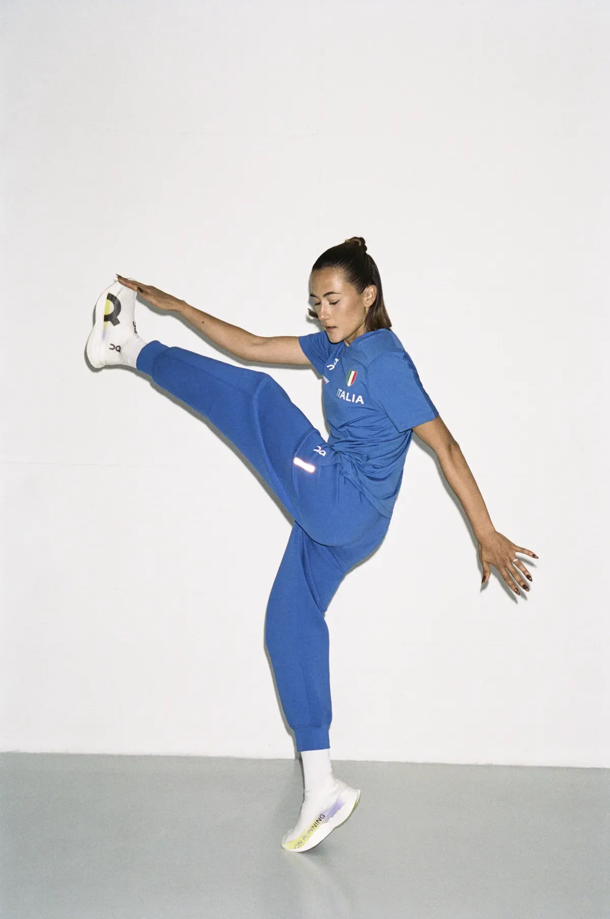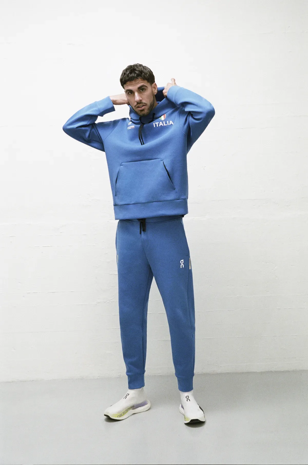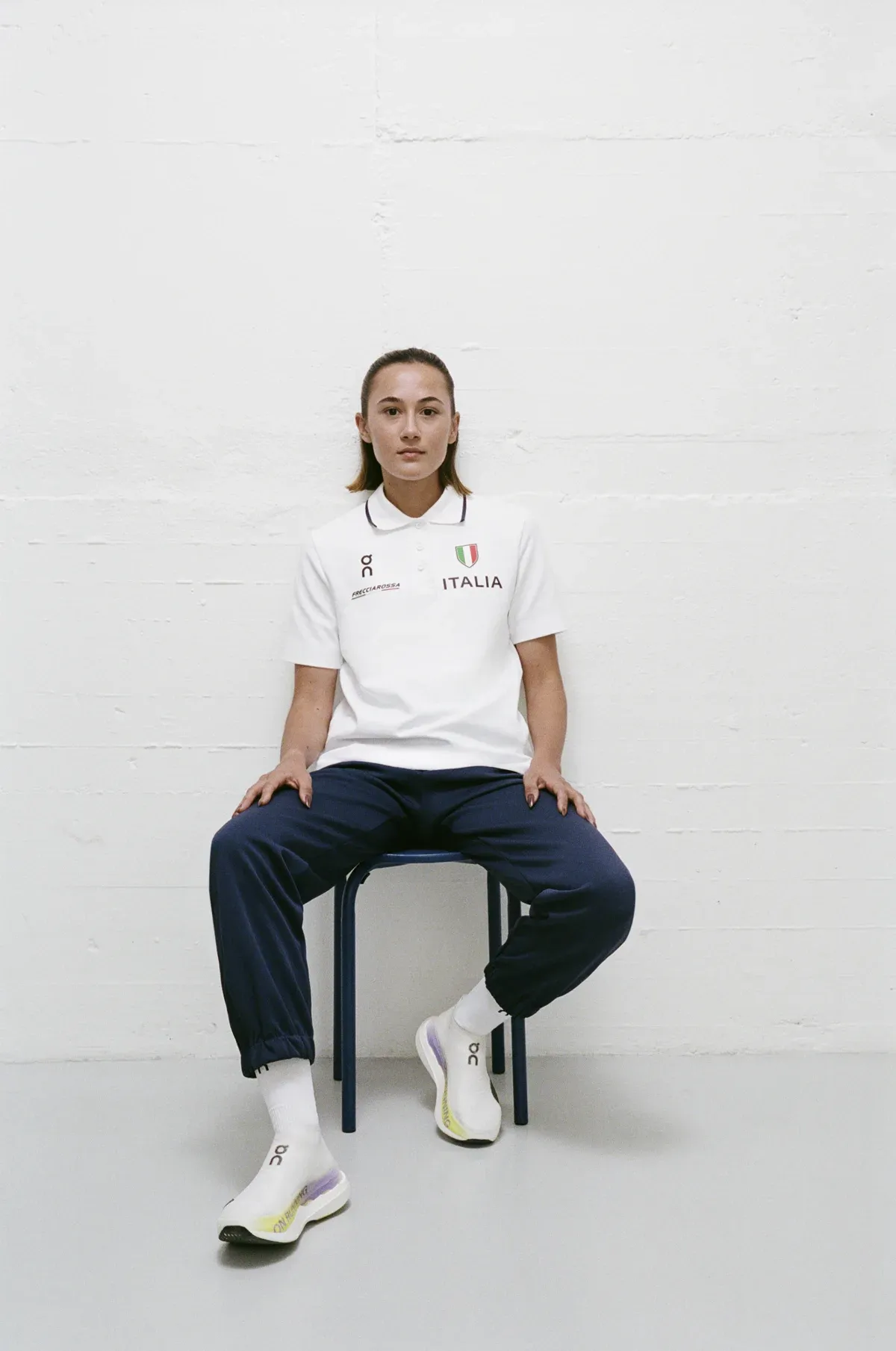 Blue has not been completely abandoned, as the solid color features on tracksuits with a modern silhouette, worn by athletes before competitions. For official events, a white polo shirt paired with navy blue pants has been created. This collection signals a new era, where the tradition of Italian athletics embraces the technical and aesthetic innovation that has always defined On.