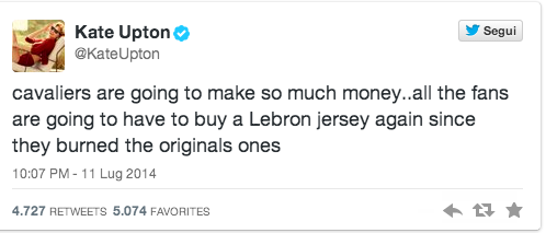Who would have thought? Kate Upton is a lot smarter than what her sensational curves might say. Indeed, the beautiful American pointed out that all the fans of Cleveland, which at the time of this lily Decision1.0 reacted by setting fire to several jersey LBJ, will now have to spend some money to buy them.