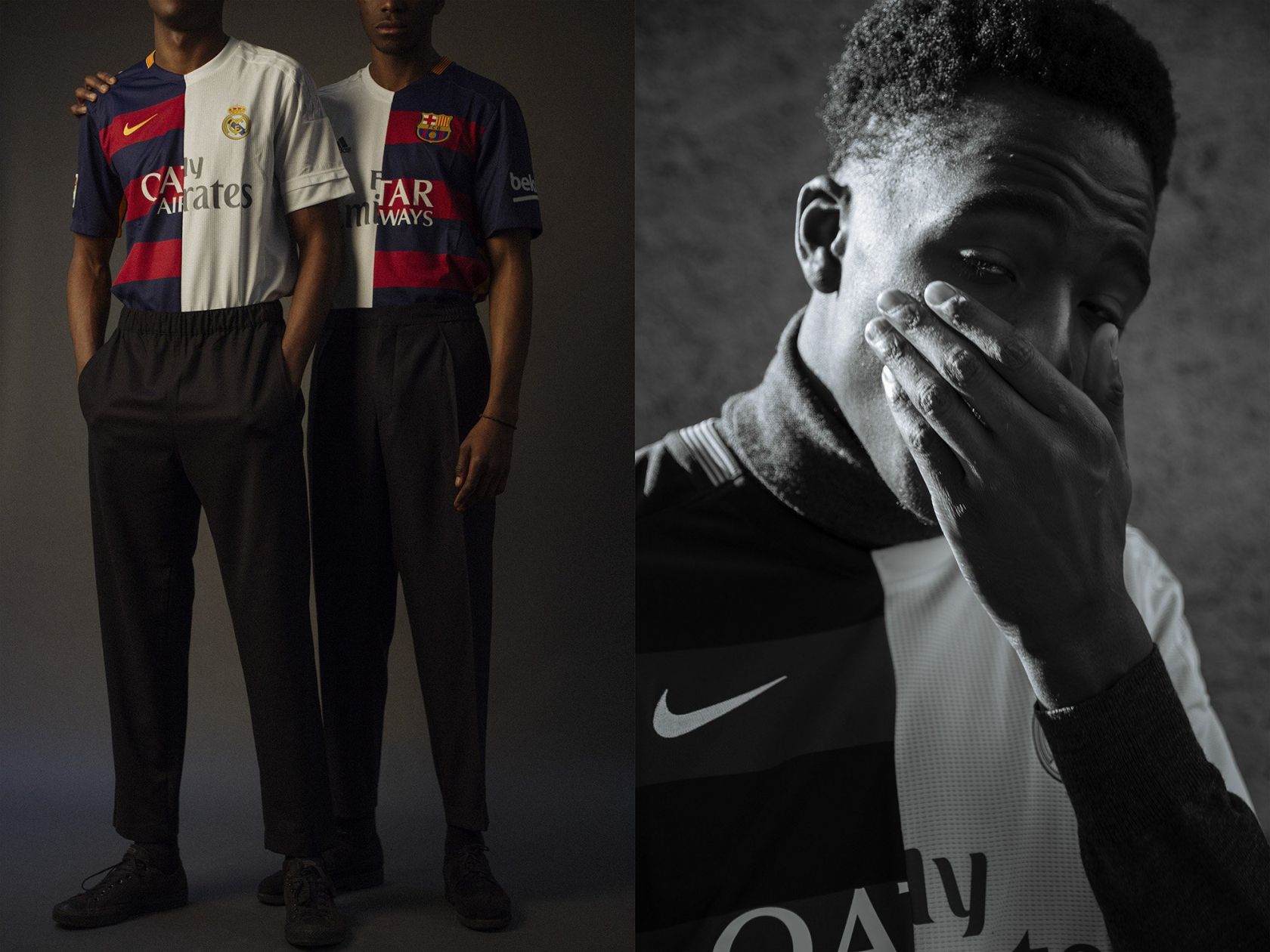 It deals with jersey composes for half from the jersey of the Barcellona and half from the Real Madrid one, a rivalry that in the last years has become so strong to end with lacerate the Spanish National team. But it is not the only implicit reference in the message: the technical sponsors of the two teams in fact, Nike and adidas, tell us about the most massive sporting rivalry among brand in the history of football and also the two mains sponsor, Fly Emirates and Qatar Airways, are flying company from different countries.