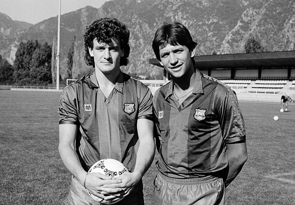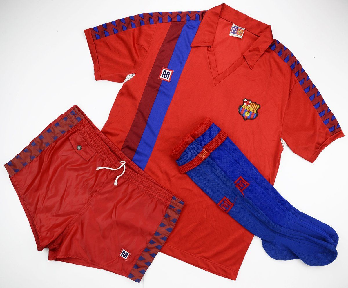 "Made by Catalan brand Meyba with bold red, yellow and blue colouring and oversized V-neck collars this collection of classic Barcelona shirts are some of the most iconic of all time. The 1984 -89 range of home, away (yellow), third (sky blue) and fourth (red) FCB shirts signpost two memorable eras at the Camp Nou. The first was that of manager Venables (El Tel) with his English invasion of tactics and players with British signings Lineker, Hughes and Archibald. Despite lacking the flair and panache of superstar Diego Maradona who departed in 1984, the side went onto win La Liga in 1985 – remarkably their only league title in the ‘80s.