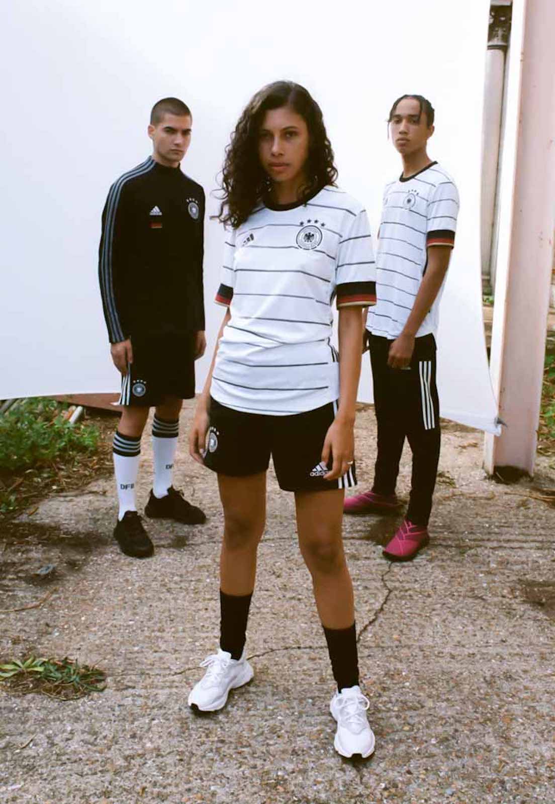 Una delle particolarità della maglia che sa tanto di nuovo trend sperimentale è l'assenza delle Three Stripes sulle spalle, che risaltano invece sui fianchi, sui pantaloncini neri e nei calzettoni bianchi. Il logo adidas è posizionato sul petto a destra mentre a sinistra è inserito il crest della squadra, con le quattro stelle simbolo degli altrettanti titoli mondiali. La Germania aveva già vestito in tempi recenti delle maglie a righe orizzontali, quella rossonera che la Mannschaft ha indossato in occasione dei Mondiali 2014 e quella verde scuro vista ad Euro 2016. Se c'è un kit che ricorda vagamente quello appena presentato da adidas, è quello indossato dalla Nazionale Francese e disegnato appositamente da Karl Lagerfeld.