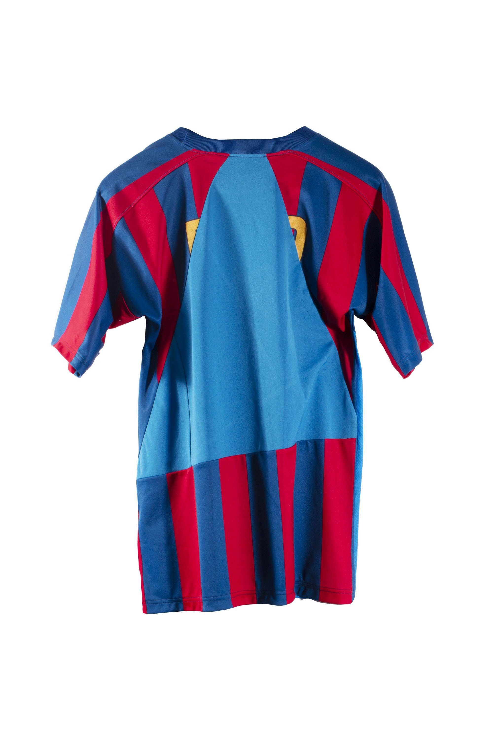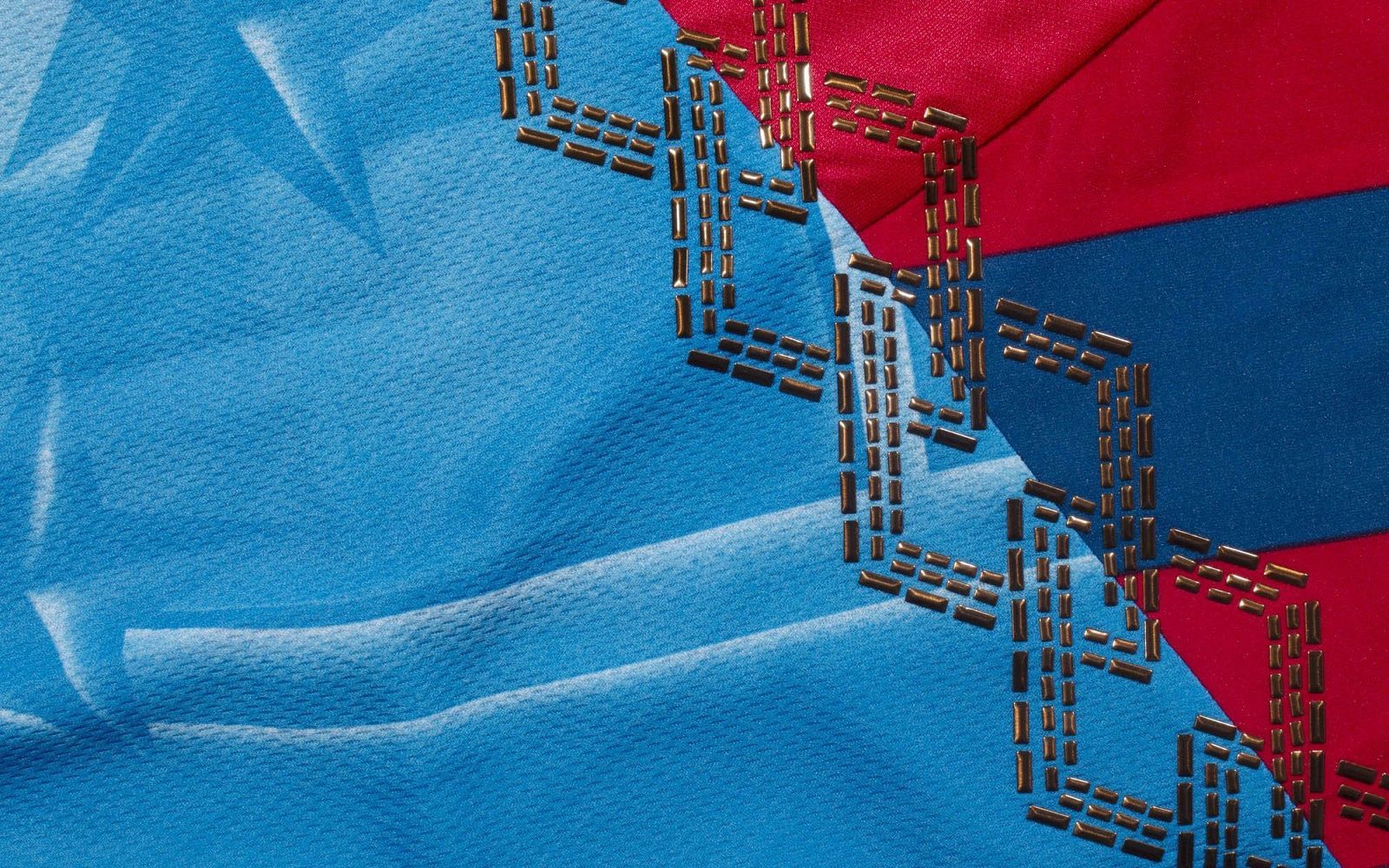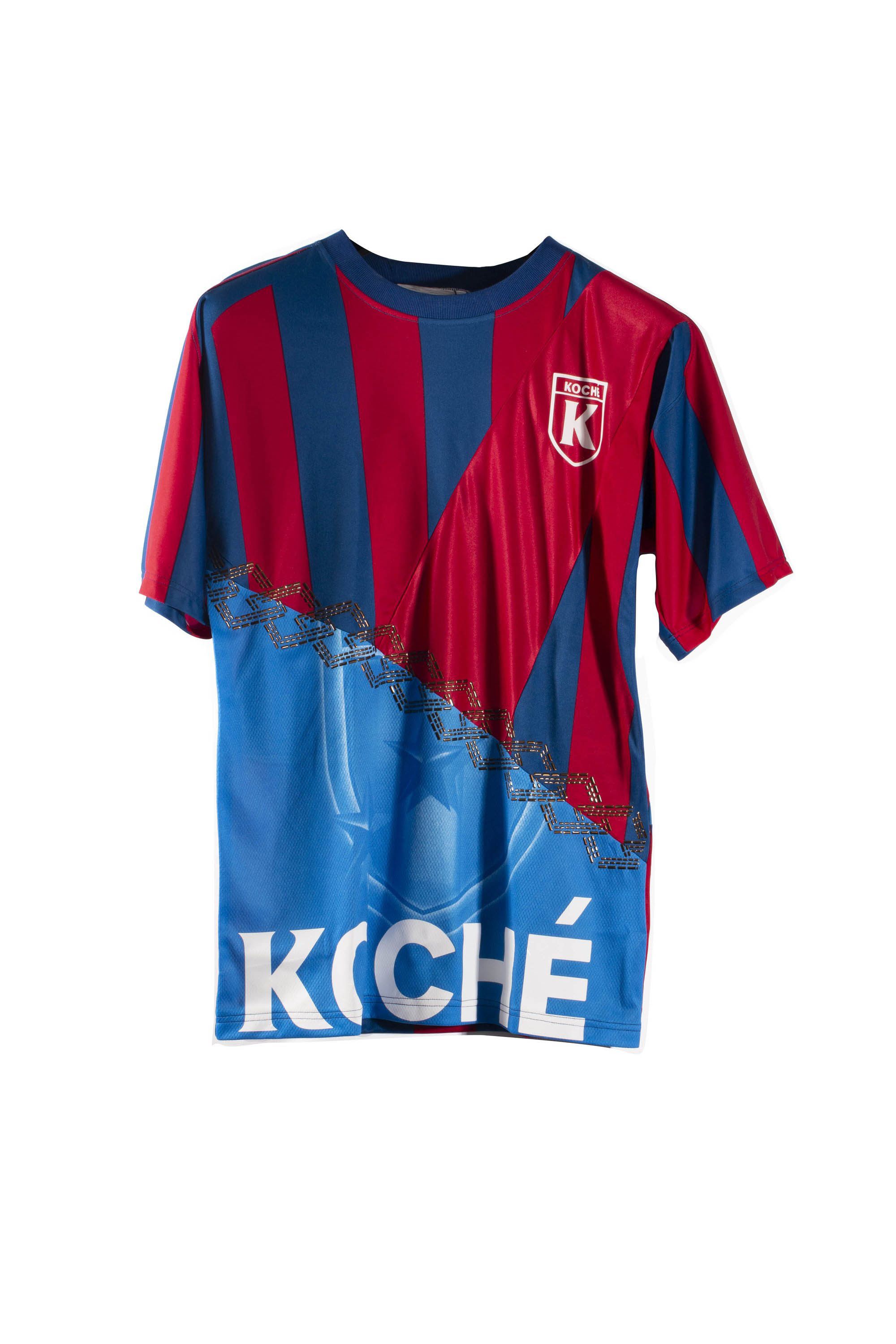 Questo pezzo unico realizzato nei laboratori parigini del brand è composto da due divise da gioco vintage riprese da KOCHÉ e combinate in un kit che unisce strisce rosse e blu al celeste. I loghi della brand in bianco e i dettagli metallici trasversali completano il design di questa nuova maglia, che sul retro ricorda molto l'home kit Nike del Barcellona nella stagione 2005-2006.
