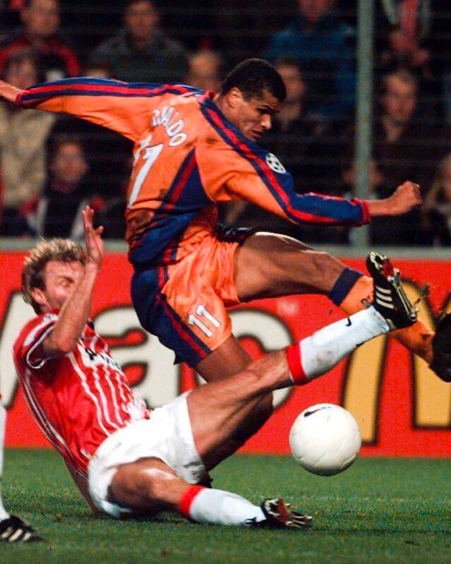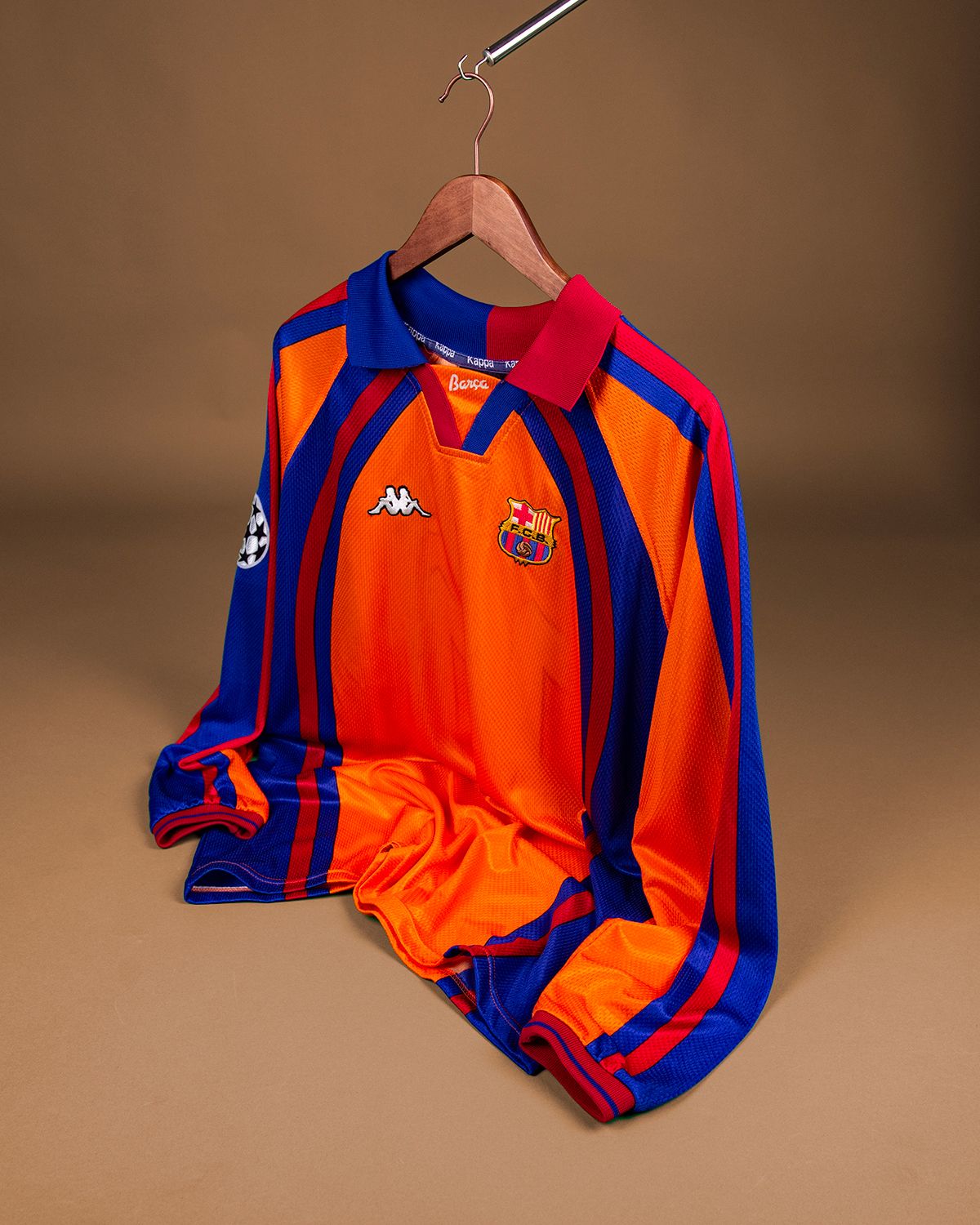 Nella stagione 1997/98 anche il Barcellona utilizzò una maglia speciale per la Champions League. Anzi due dato che Kappa, all’epoca sponsor tecnico dei bluagrana, ridisegnò sia la maglia Home che quella Away. La prima maglia, già rivoluzionata in quell’anno dato che era stato abbandonato il classico design a barre verticali, venne ricreata con un sorprendente schema che prevedeva righe più larghe al centro e più sottili ai lati. Un design in parte riproposto anche per la maglia Away arancione, indossata in un’unica occasione nel corso della partita in trasferta contro il PSV. Sempre nel corso di quella stagione si videro delle variazioni sul tema anche dal Manchester United, con una maglia in tinta unita rossa che sostituiva la Home con sfumature e pattern geometrici sulle maniche.