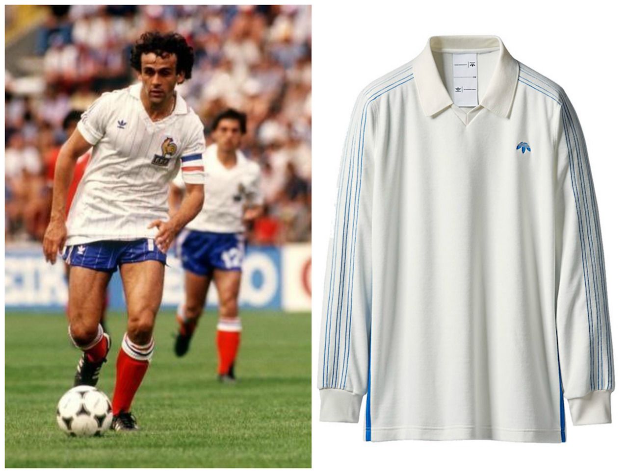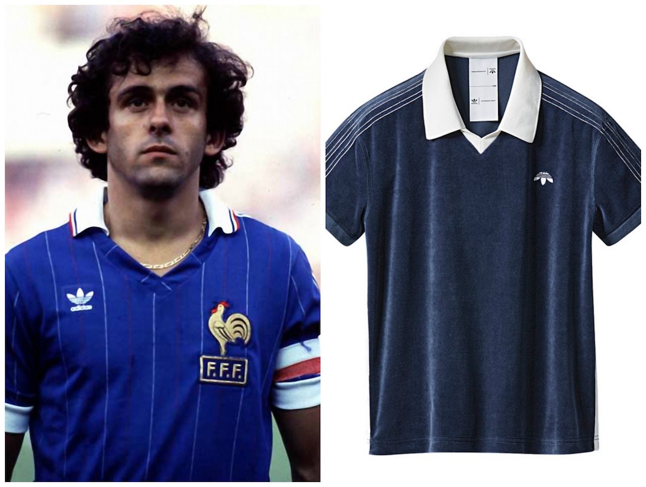 Le divise che adidas ha realizzato per la Francia sono state, per anni, benchmark di eleganza ed essenzialità. Il “gessato” fu introdotto nella tradizione calcistica proprio da quelle divise, magistralmente indossate da Platini. Il colletto e la linea di due di quelle maglie vengono qui riprodotte.