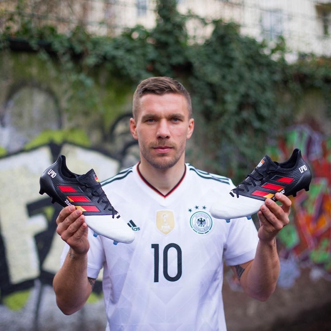 adidas, che da sempre veste la leggenda tedesca, gli ha preparato per l'occasione delle ACE17.1 speciali, con la bandiera tedesca a far da padrona. Metà bianche e metà nere, queste ACE17.1 vedranno sventolare la bandiera tedesca dentro le 3 stripes. Altri dettagli sono la data di questa sera sotto le 3 strisce, le sue iniziali con il suo numero (LP10), e la bandiera della Germania e del Colonia rispettivamente sulla linguetta della scarpa destra e sinistra.