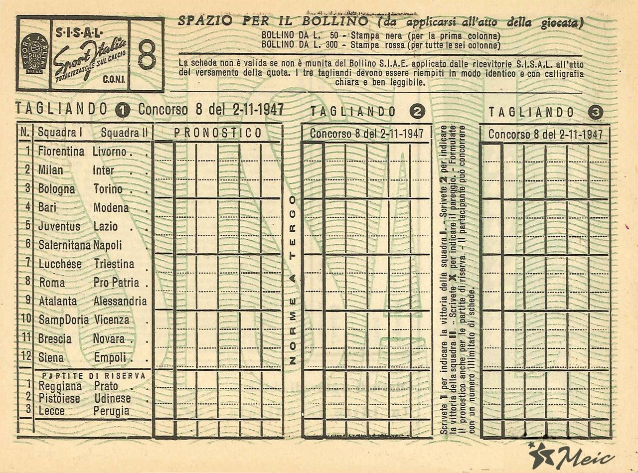 La Schedina infatti funzionava in maniera leggermente diversa dalle attuali scommesse: tutte le 12 partite del campionato si svolgevano insieme e si vinceva facendo 11 o 12. Il primo a farlo fu Emilio Blasetti nell’estate di quello stesso anno.