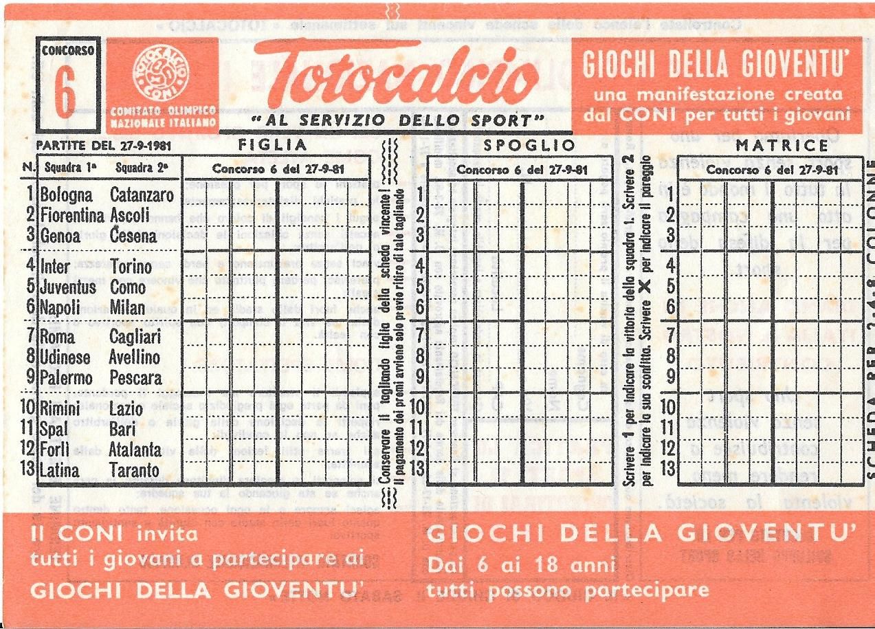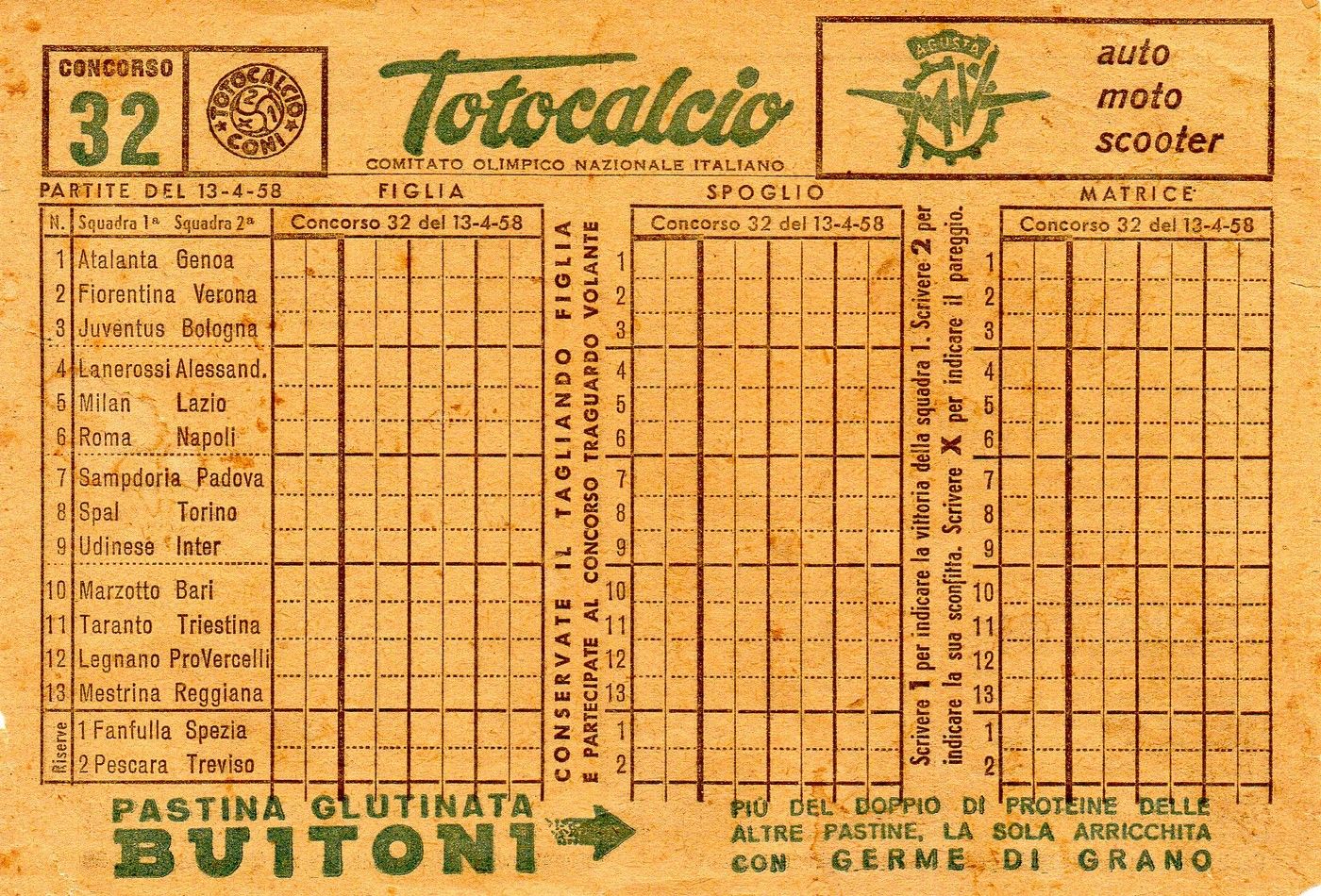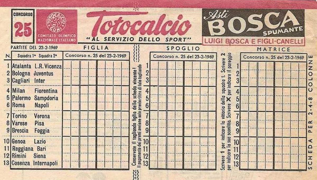 Lontani dagli scandali scommesse, dalle partite truccate e dall’ingerenza delle agenzie di betting sulle divise delle squadre c’era la Schedina. Il popolare sistema di scommesse inventato da Massimo della Pergola il 5 maggio del 1946 ebbe il merito di far rinnamorare dello sport un paese lacerato dalla guerra e si installare in maniera istantanea un rituale – quello del sabato pomeriggio – che avrebbe presto coinvolto tutta l’Italia.