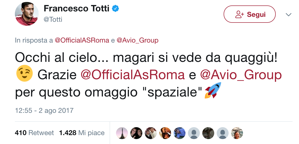 La Roma ha annunciato sul suo sito ufficiale che stanotte alle 4 ora italiana la maglietta numero dieci di Francesco Totti ha lasciato la Terra verso lo spazio a bordo del vettore Vega. La maglietta lanciata in orbita è una replica di quella indossata dall’ex capitano della Roma il 28 maggio all’Olimpico nella sua ultima partita ufficiale contro il Genoa. L’iniziativa è nata come omaggio al Capitano sui social della Roma a metà luglio. L’impresa è stata realizzata da Avio, gruppo internazionale leader nella realizzazione e nello sviluppo di vettori spaziali, nella sua base di lancio nella Guyana francese.
