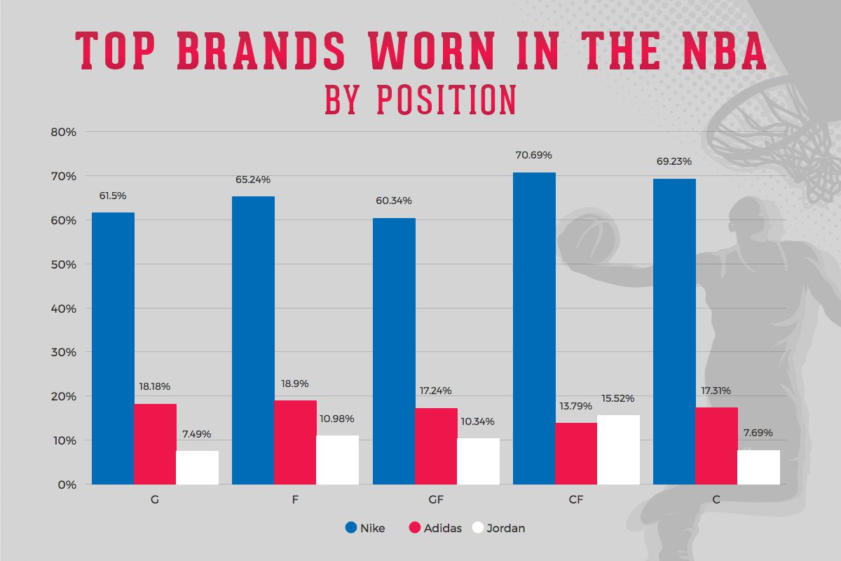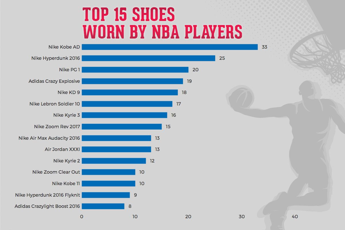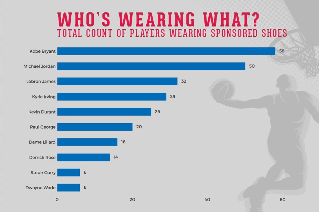 La scarpa lanciata dal Black Mamba durante la sua ultima stagione in NBA è indossata da ben 33 giocatori nella lega, seguita dalle Nike Hyperdunk 2016 (25 giocatori), Nike PG1 (20), adidas Crazy Explosive (19) e le Nike KD 9 (18). Bryant non domina solo la classifica dei modelli più indossati, guardando al numero totale di signature sneaker è davanti a Lebron James e a Micheal Jordan, con 58 giocatori contro ripettivamente 50 e 32. Da un punto di vista dei brand, Nike conferma il dominio assoluto sull'NBA: il 64 per cento dei giocatori indossano un modello firmato dallo Swoosh, mentre solo il 17,7 per cento hanno scelto adidas, che infatti sta cercando di convicere molte giovani stelle a firmare con le tre strisce.