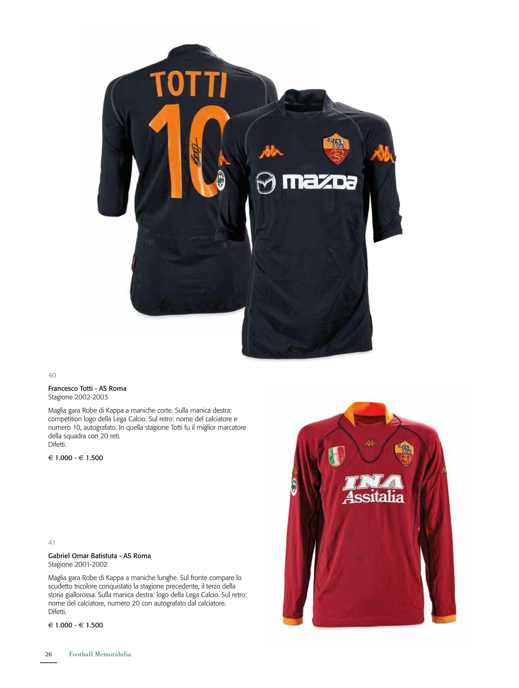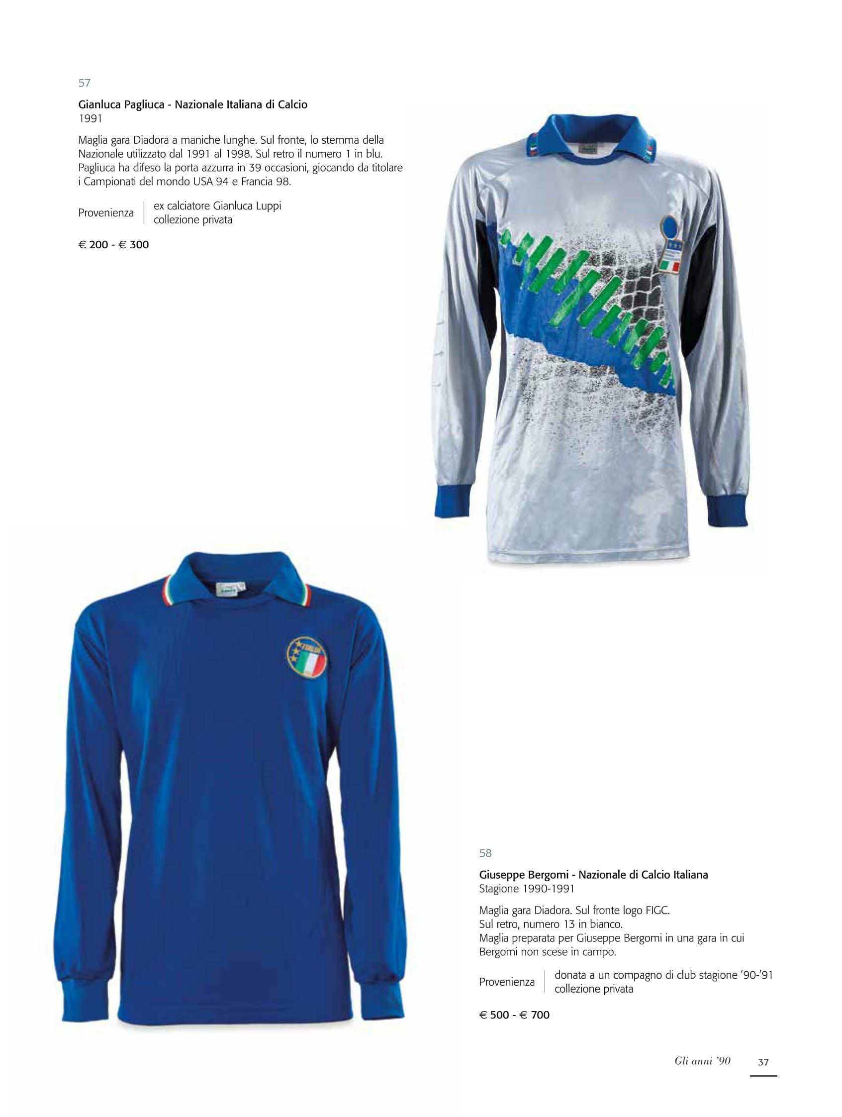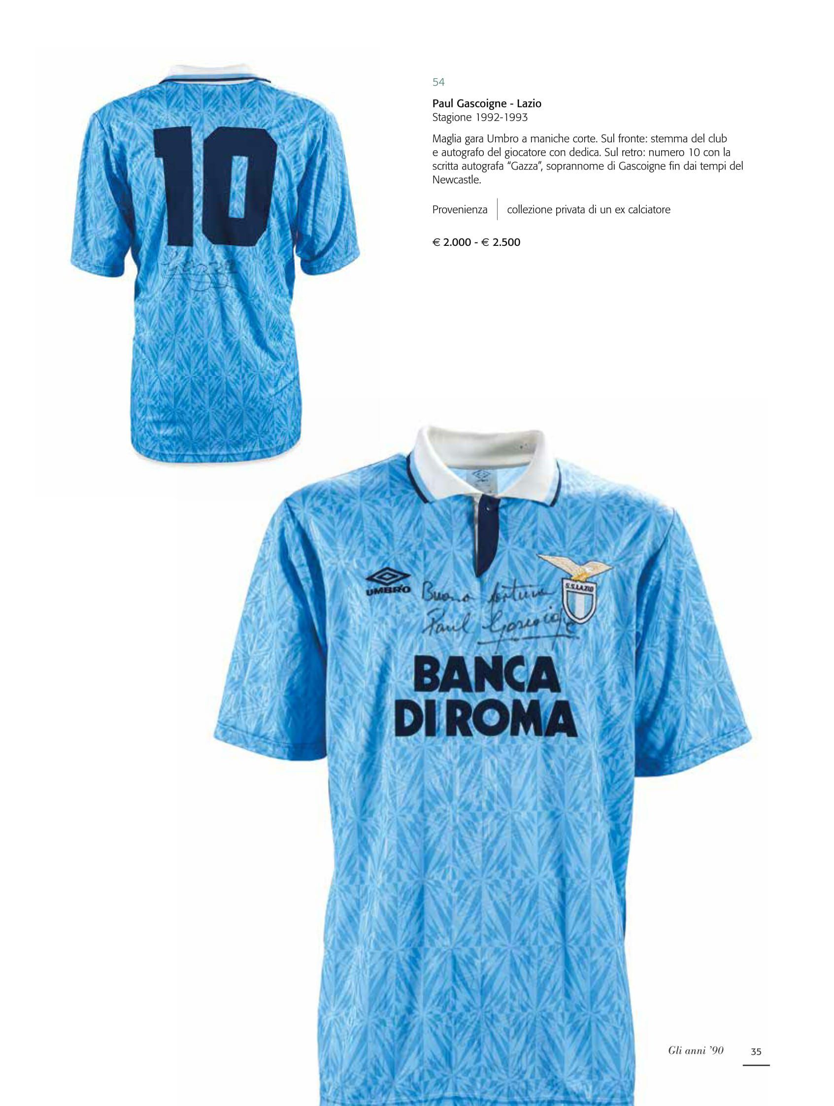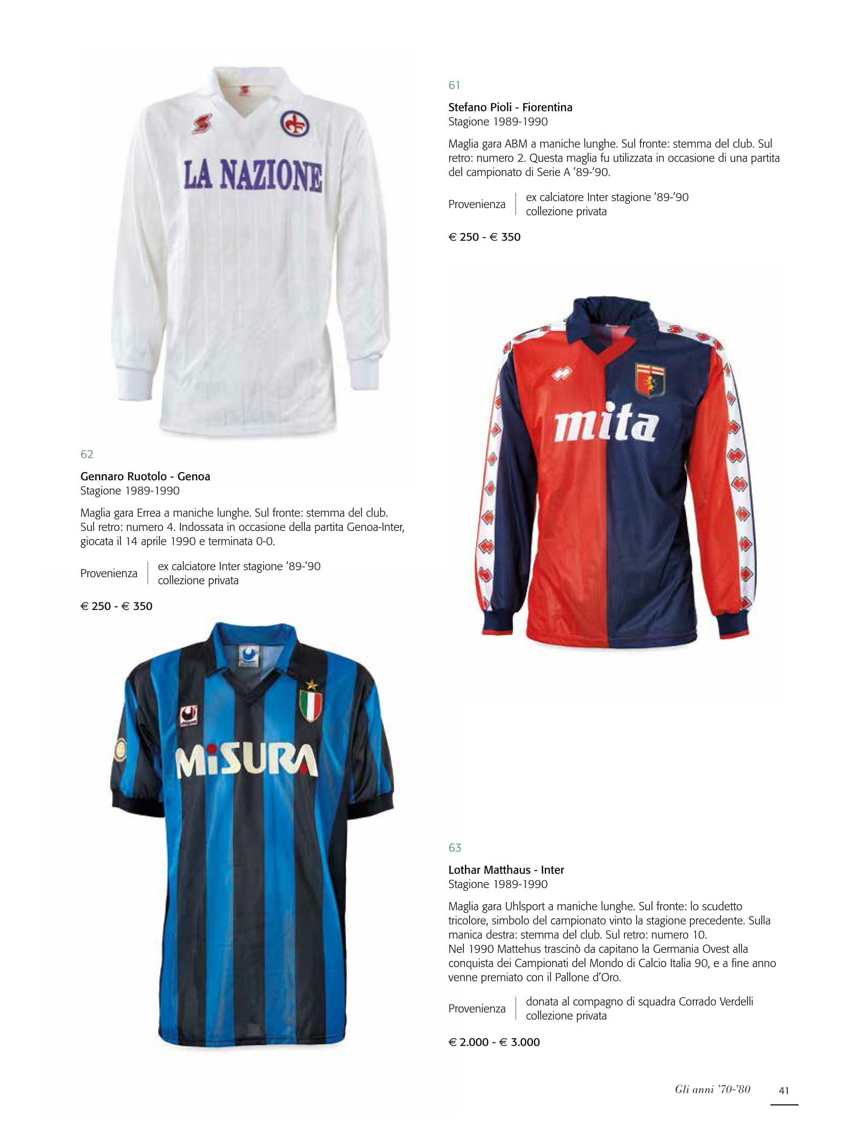 Per quanto riguarda i club l'offerta non è da meno, con sempre il numero 10 protagonista. Sarà battuta la maglia del Brescia di Roberto Baggio, una di Totti, la storica divisa Umbro della Lazio di Paul Gazza Gascoigne, la 10 di Mancini alla Sampdoria e quella di Gabriel Omar Batistuta. Altre magliette interessanti in vendita sono quelle del Milan di Kakà e Ronaldinho e quella di Adriano del Parma.
