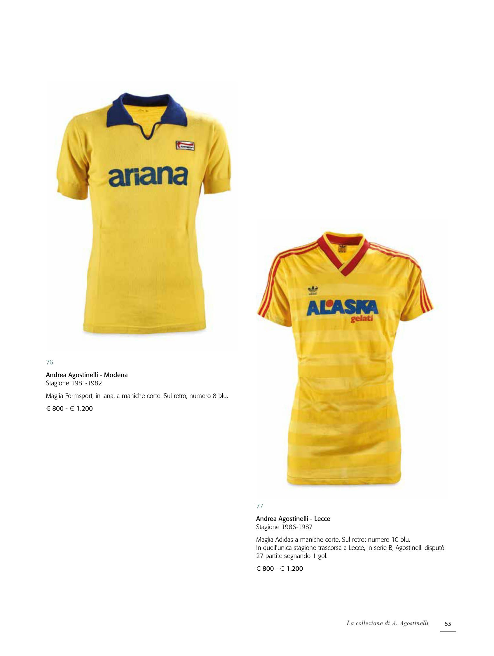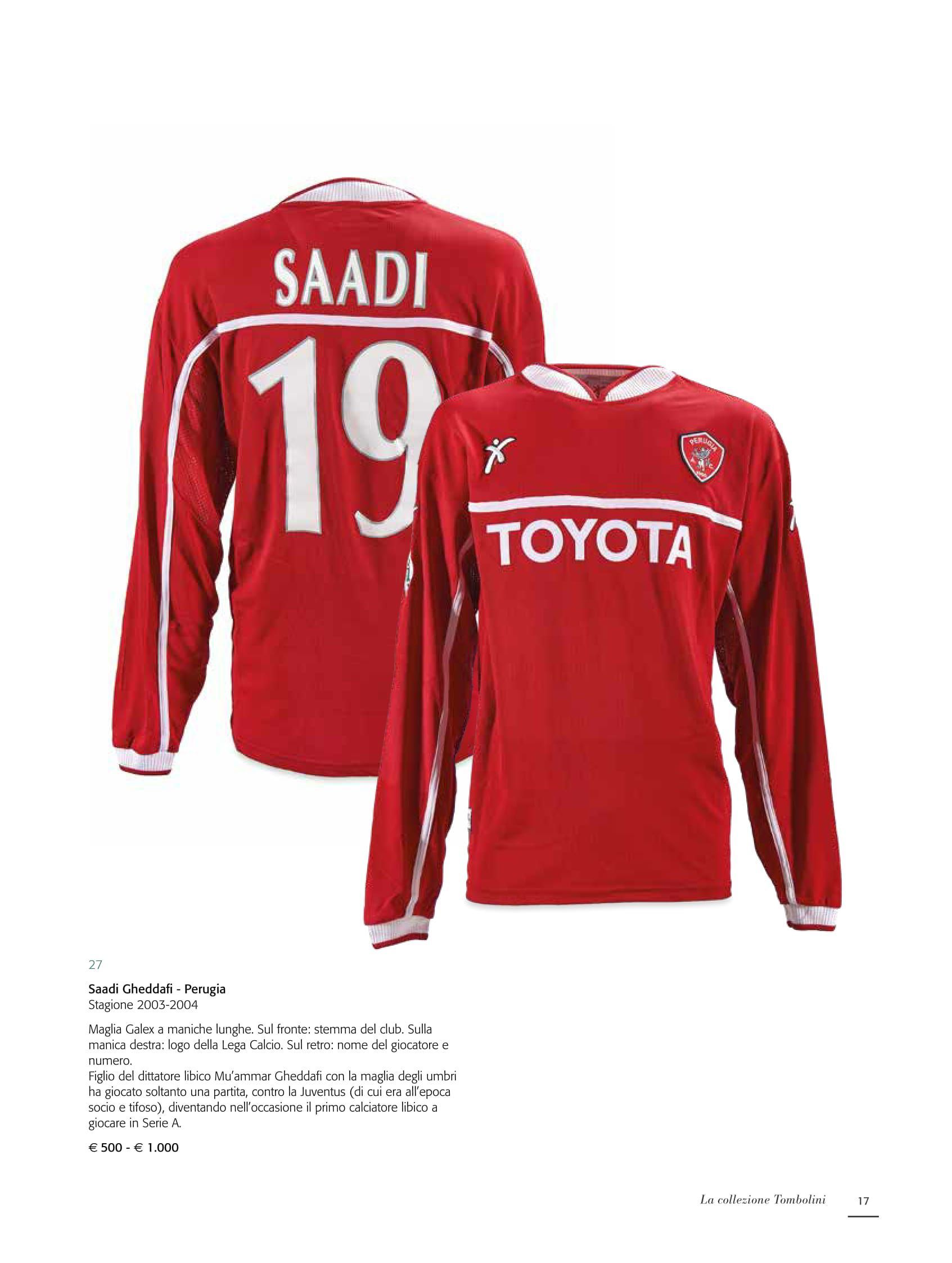 Tra i cimeli più curiosi che saranno battutti c'è la collezione di gagliardetti dell’arbitro Tombolini - molti dei quali autografati - e il pezzo più interessante di tutta la vendita a mio parere: la maglietta del Perugia di Saadi Gheddafi, figlio dell’ex dittatore libico Mu’ammar.