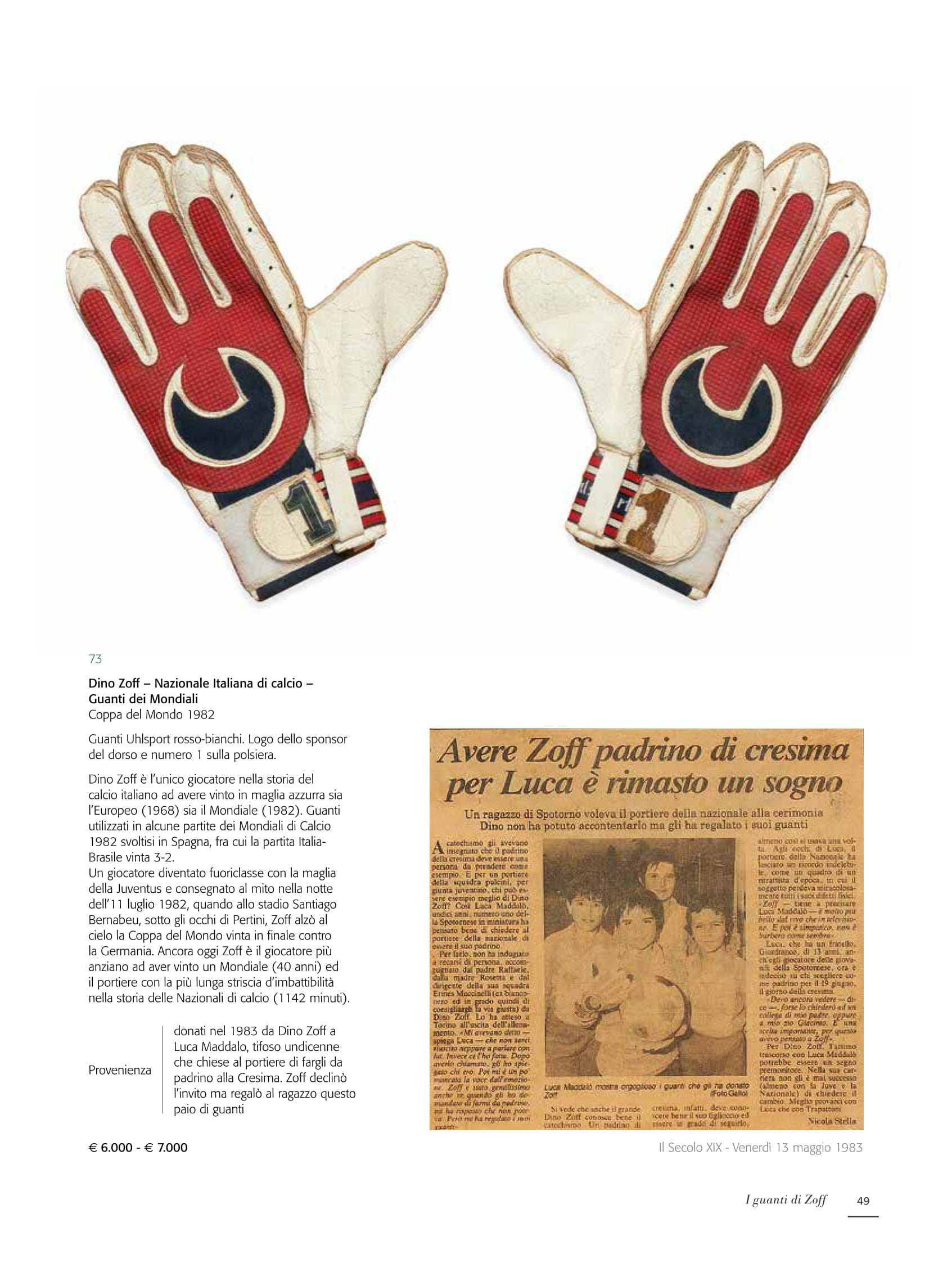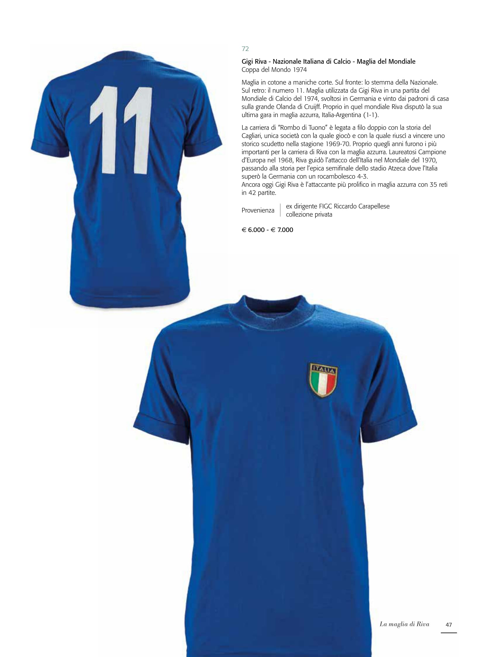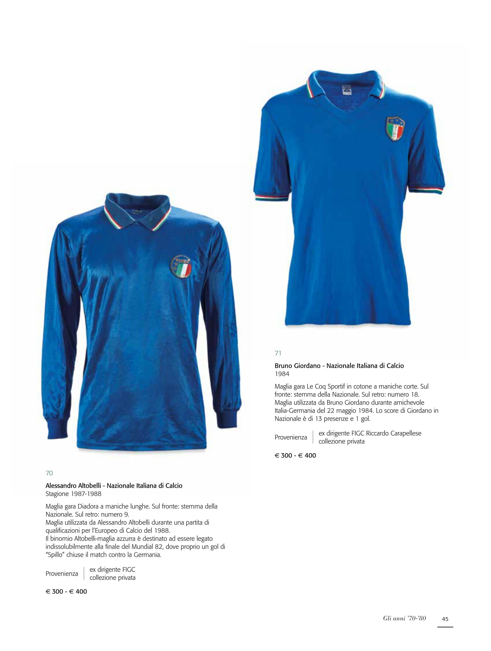Tra gli altri pezzi messi all’asta molti riguardano la Nazionale. Ci sarà la maglia di Gigi Riva del Mondiale tedesco del 1974 (stima 6-7 mila euro), i guanti usati da Dino Zoff e altre maglie di fine anni ottanta. Anche le magliette di altre nazionali saranno battute al miglio offerente, in particolare bellissime quelle dell'Unione Sovietica del 1977 e la 17 albiceleste di Pedro Pasculli prodotta da Le Coq Sportif.