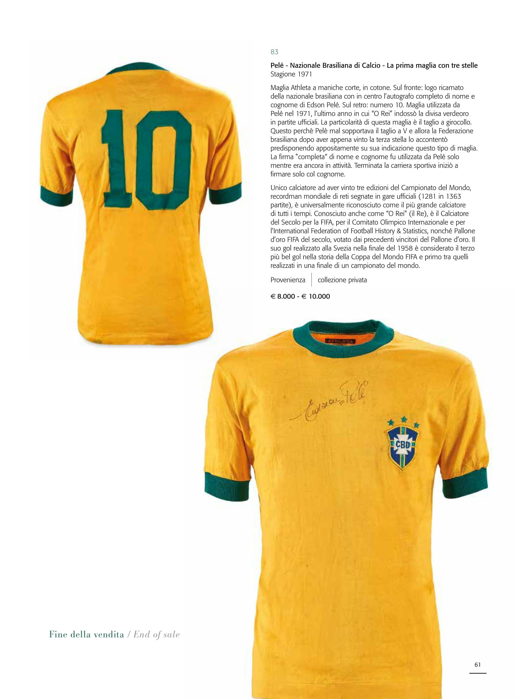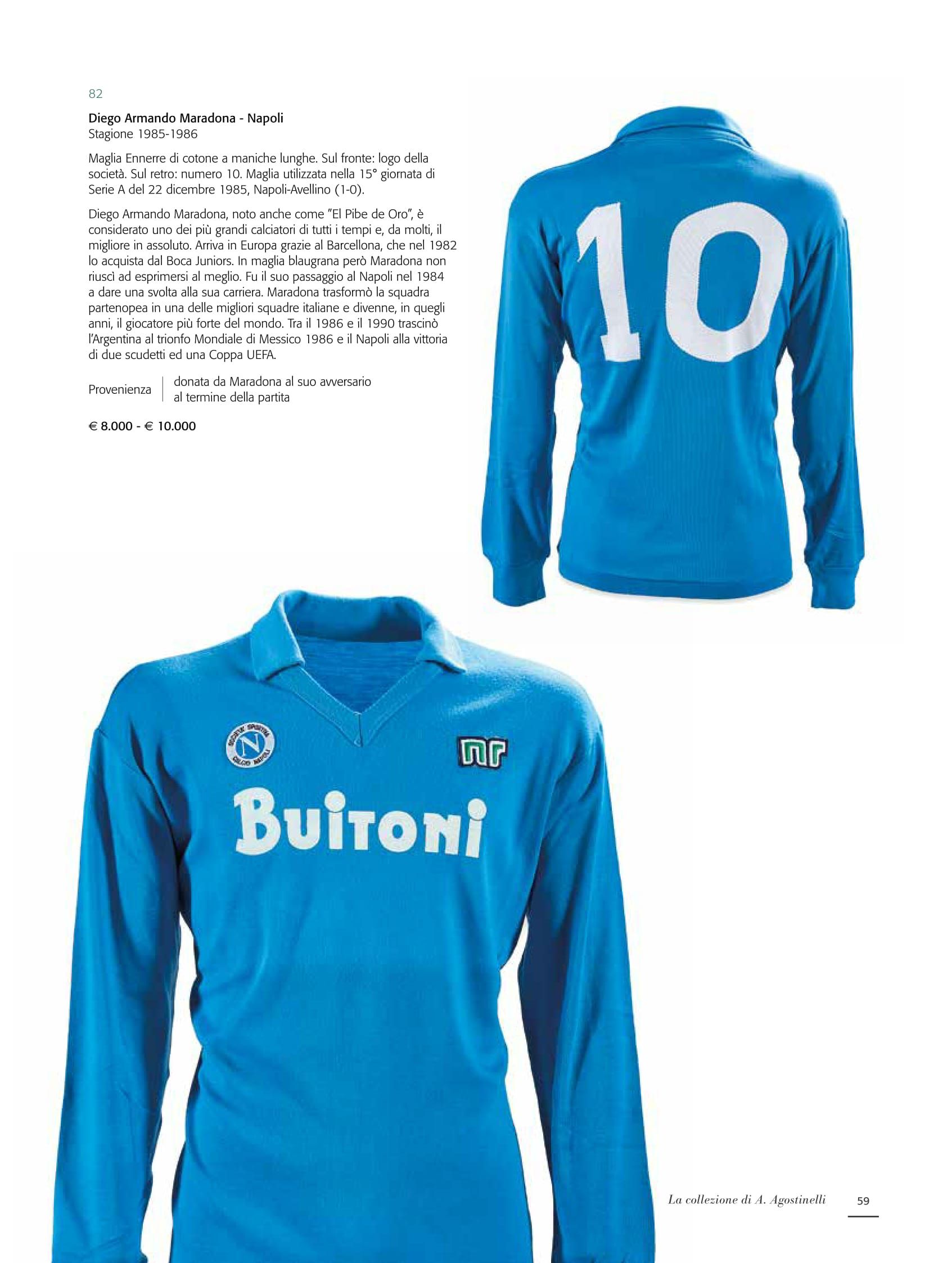 Domani a Milano torna Football Memorabilia, la più importante vendita di cimeli calcistici al mondo organizzata da Aste Bolaffi. La merce sarà quella delle grandi occasioni, i due pezzi più pregiati sono le maglie usate dai due dieci più famosi al mondo: la maglietta del Napoli di Diego Armando Maradona e quella del Brasile di Pelè del 1971. Il prezzo stimato di entrambe le maglie si aggira tra gli 8000 e 10000 euro al pezzo.