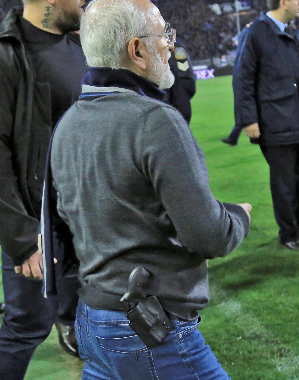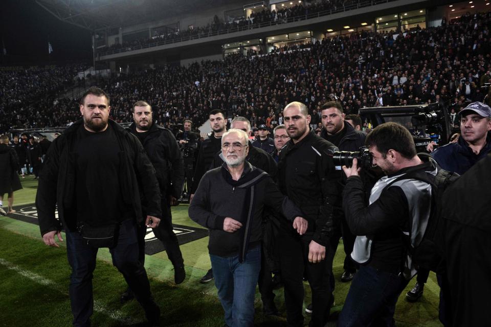 Nel momento dell'annullamento del goal, Ivan Savvidis - proprietario del PAOK - entra in campo seguito da una serie di guardie del corpo - che sembrano uscite da Gomorra - urlando ai suoi giocatori di uscire dal campo e - a quanto riportato da alcuni giornali greci ed internazionali - dicendo all'arbitro "La tua carriera è finita" e "Considerati un uomo morto". Nel video si può vedere come il capitano della squadra Vieirinha cerchi di contraddire il presidente e disperarsi quando i dirigenti raggiungono l'arbitro. Questa è stata la prima invasione di Savvidis, in cui indossando un cappotto, non mostra di portare la pistola. Dopo essere stato riportato a bordocampo, Savvidis torna furente sul campo togliendosi la giacca, rendendo ben visibile la pistola chiusa nella fondina e attaccata sul retro dei pantaloni. Dopo qualche minuto di rincorse per il campo, sugli spalti sono iniziati gli scontri tra le due tifoserie e la polizia è intervenuta per liberare il campo.