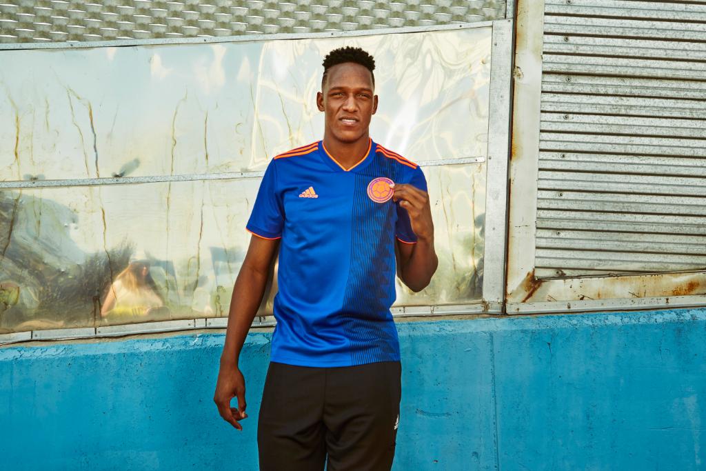 Il kit da trasferta dei Cafeteros assomiglia molto a quello da casa della Spagna, seppur con motivo a rombi su lato opposto e colore blu come tono principale. Stripes e loghi in arancione completano la maglia, che potete trovare qui.