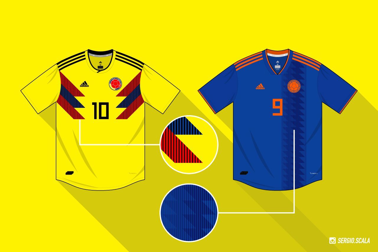 La maglia de Los Cafeteros si inserisce perfettamente nel filone nostalgico scelto da adidas per il Mondiale 2018. La maglia home è una diretta citazione della divisa indossata durante Italia 90. Il classico giallo della Colombia è impreziosito da tre strisce, due rosse e una blu, piuttosto appariscenti, sul petto, copiate quasi di sana pianta dal kit del 1990. Le stripes di adidas, anch’esse blu, sono poste sulle spalle, confermando questa nuova linea grafica comune a molti kit appena rilasciati. Anche i pantaloncini blu richiamano quelli utilizzati per le notti magiche italiane, mentre i calzettoni sono diversi, essendo rossi anziché gialli. La divisa da trasfera è blu notte con dettagli arancioni.