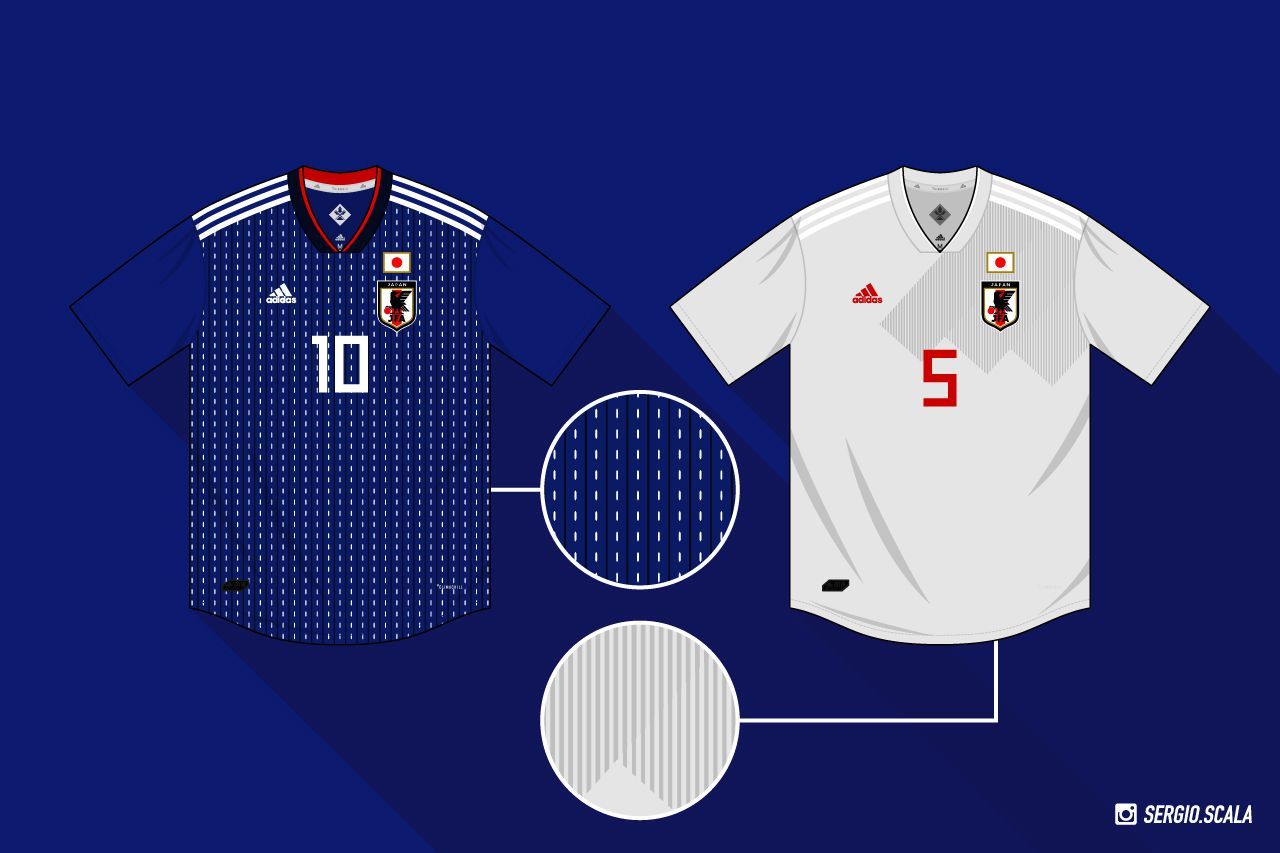 L'unico design adidas fuori dal tema nostalgia è quello del Giappone, a nostro giudizio una delle divise più eleganti dei Mondiali 2018. La colorway della divisa home riprende il classico blu intenso e profondo del nazionale giapponese decorato da delle striscie verticali di colore più chiaro. Queste strisce sono una citazione dello sashiko, una particolare tecnica di cucitura giapponese utilizzata per decorare i tessuti trapuntati che accompagnano il kimono. La maglietta porta il nuovo logo della Nazionale, fresco di restyling. La divisa è completata da pantolincini e calzettoni blu scuri. La maglia away invece è color bianco sporco, con un pattern di linee sottili che compongono le three stripes adidas sulla spalla sinistra.