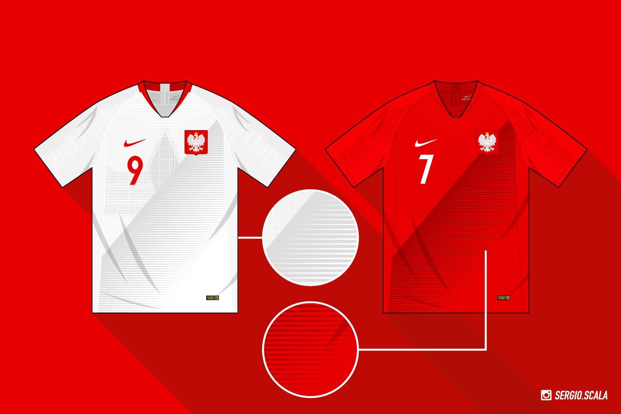 Nike ha scelto di rappresentare la Polonia attraverso il suo emblema nazionale: l'aquila. L’apertura alare dell’aquila è rappresentata dal taglio diagonale presente nel design dei due kit, bianco quello home e rosso quello away. Nella maglia da casa si presenterà come una sfumatura grigia che taglia a metà la parte frontale della jersey, mentre in quella da trasferta avrà una sfumatura più scura di rosso. Saranno invece invertiti i colori di loghi, nomi e numeri, rossi sulla maglia home e bianchi su quella away. L’aquila sarà presente anche sulla parte posteriore del colletto a V, che come il resto delle divise garantirà il massimo livello di traspirabilità.