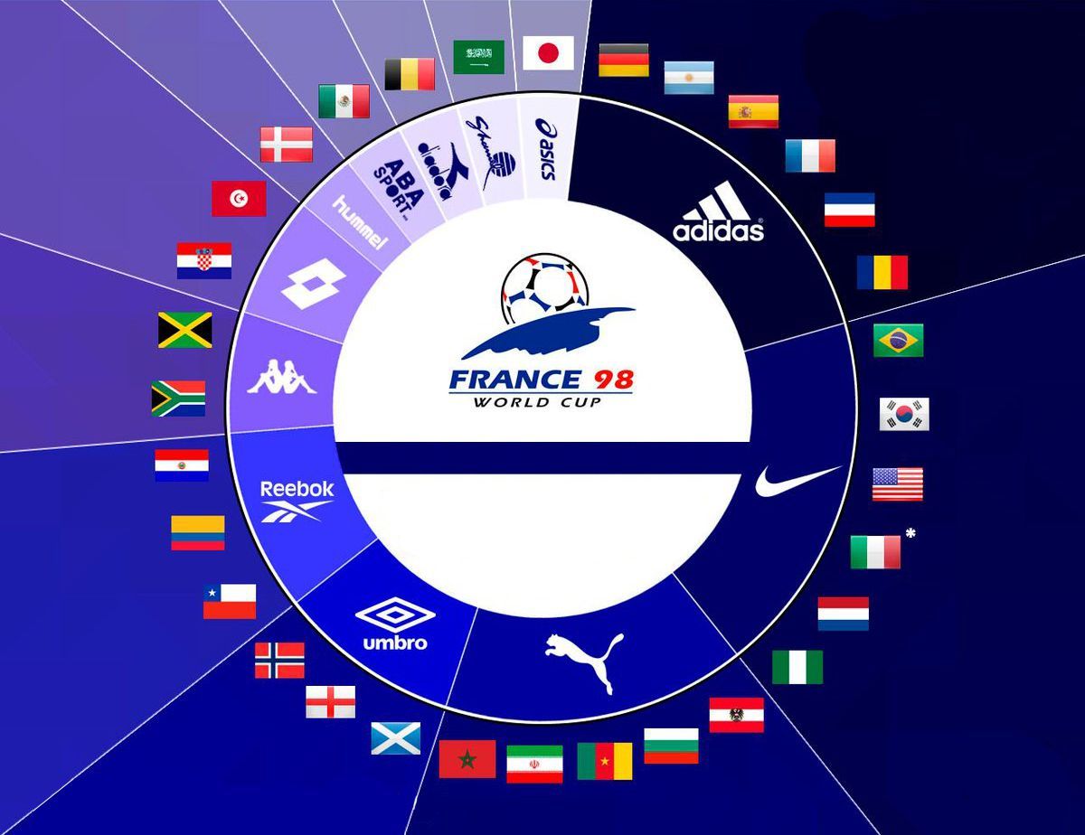 Chi vestiva le squadre a Francia 98 Un'interessante grafica ci mostra i brand che fornivano i kit per le maglie del torneo francese