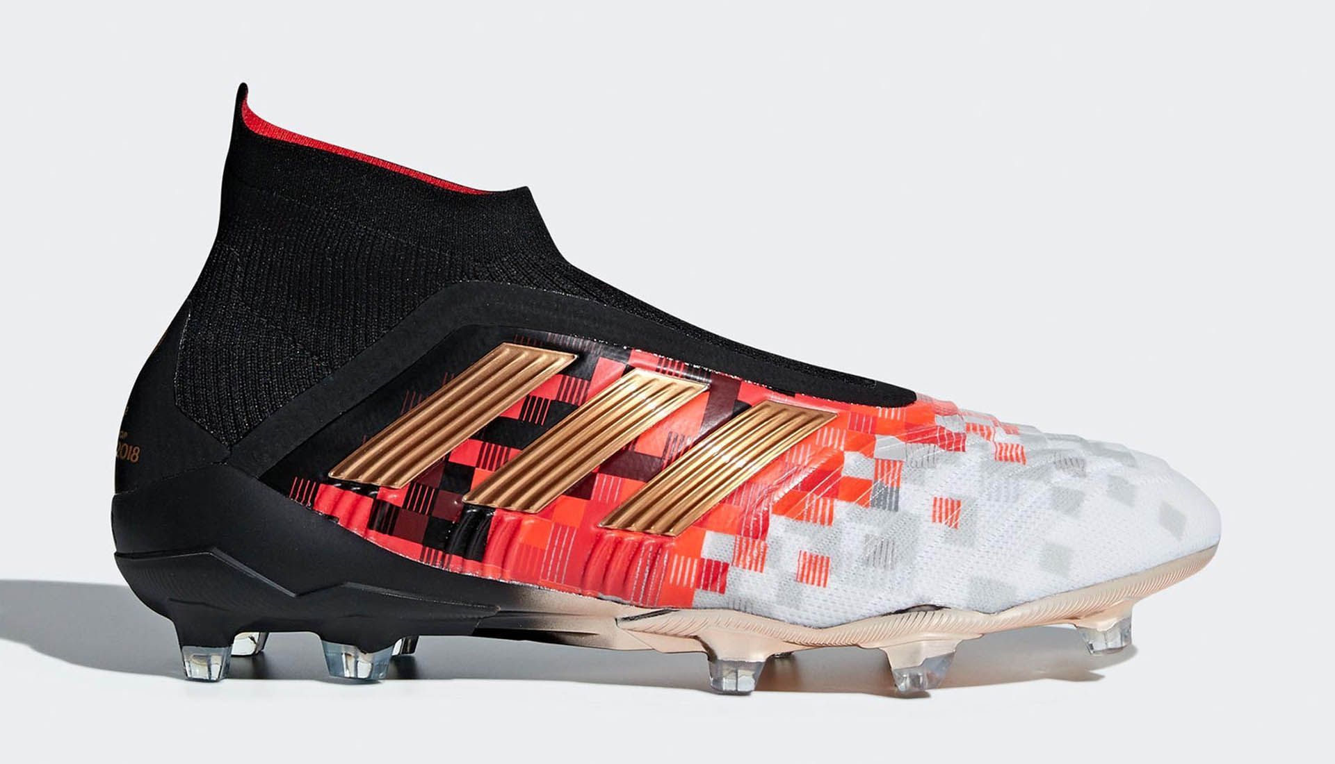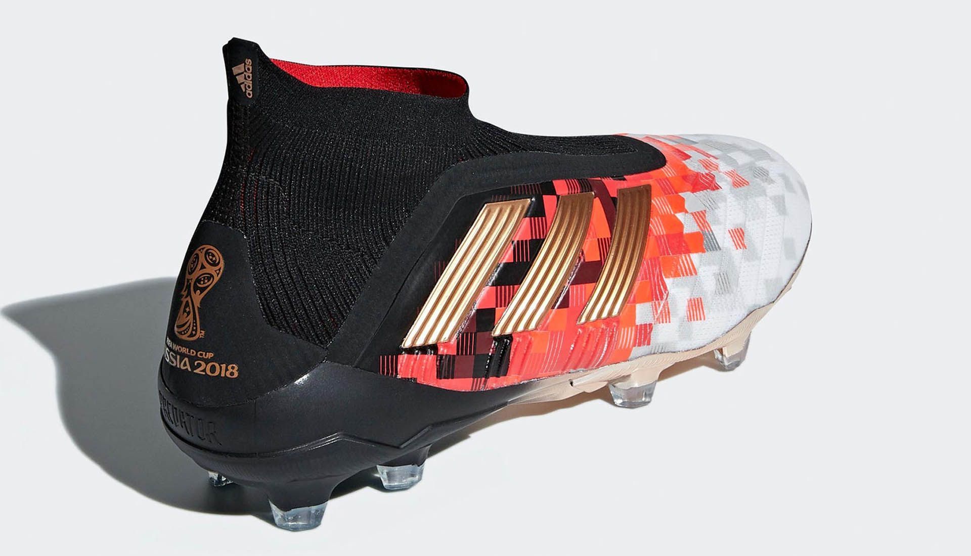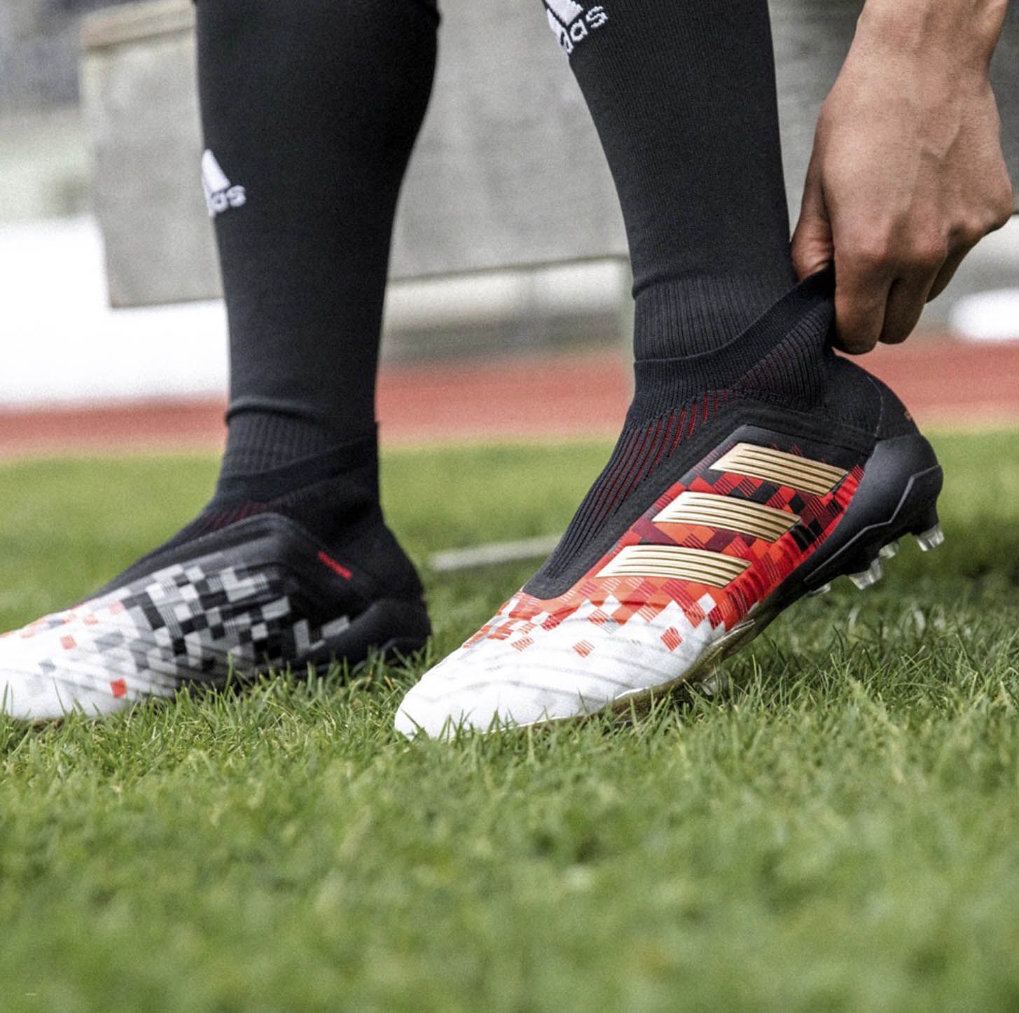 I tre colori principali del pallone - bianco, rosso e nero - si sviluppano dalla parte frontale della tomaia al fondo. La punta bianca lascia il posto al rosso attraverso un pattern pixelato, stessa cosa che succede tra il rosso centrale e il nero sul tallone. Essendo il modello 18+, questa Predator Telstar è laceless, con il sock che mantiene la colorazione nera. La scarpa presenta anche dettagli in oro, in particolare nel branding adidas laterale e nella parte frontale del soleplate. Sul tallone, infine, si può trovare lo stesso logo presente sulle Copa Mundial riservate agli arbitri del Mondiale, ovvero il logo di Russia 2018. A quanto possiamo capire, gli atleti adidas non indosseranno questo paio di Predator 18+ ‘Telstar’, ma rimarranno con le scarpette dell’Energy Mode Pack.