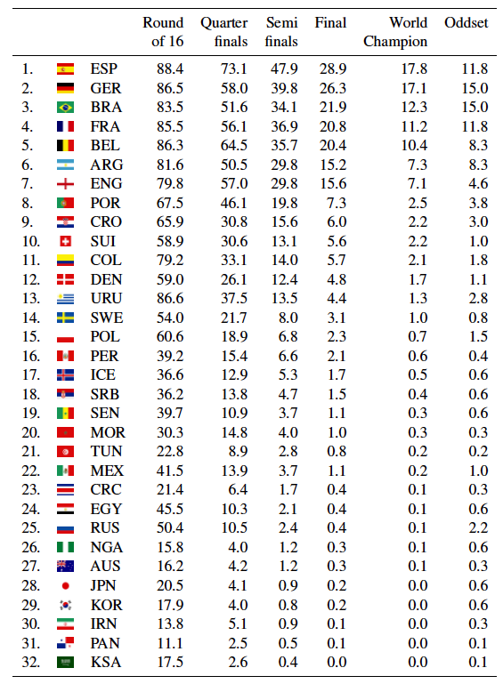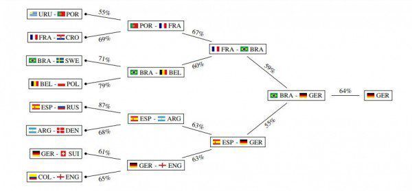 Secondo questo calcolo la squadra favorita per la vittoria del titolo è la Spagna, con il 17,8% di possibilità di alzare al cielo di Mosca la Coppa il prossimo 15 luglio, seguita in rapida sequenza da Germania (17,1%) e Brasile (12,3%). Ma ciò che stupisce maggiormente è l'osservazione della simulazione che riguarda l'intero percorso ad eliminazione diretta delle squadre, e cioè a partire dagli ottavi di finale. Nonostante le raccomandazioni iniziali degli stessi ricercatori di prendere con la giusta serietà le previsioni, infatti, in caso di approdo ai quarti la squadra favorita per il titolo risulterebbe essere proprio la Germania di Joachim Löw.