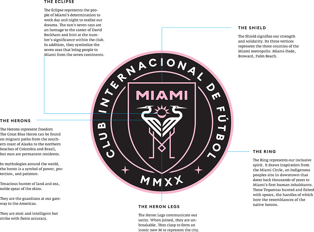 - Il simbolo dell’eclissi di sole, che rappresenta la determinazione degli abitanti di Miami nel lavorare notte e giorno per realizzare i propri sogni. Il sole ha sette raggi, omaggio al leggendario numero di David Beckham e ai sette mari da cui provengono tutti gli abitanti della città.