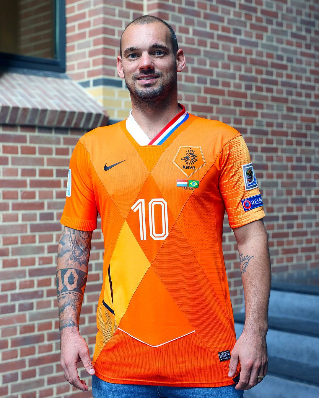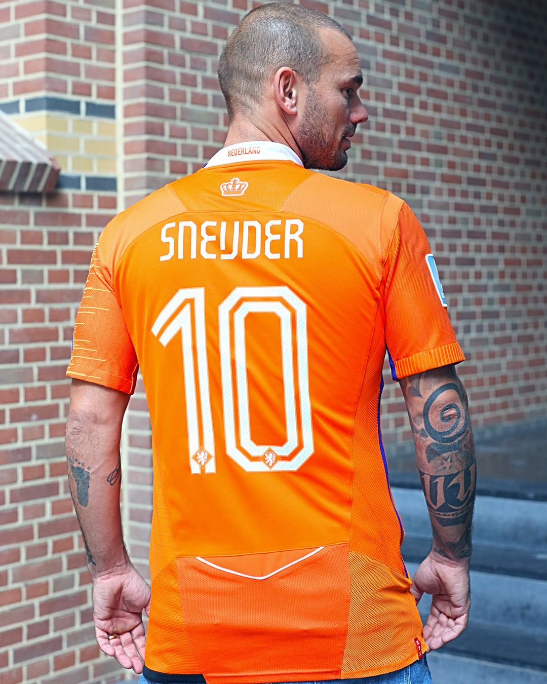 La maglia presenta dettagli da tutte - o quasi - le divise Nike della nazionale indossate da Sneijder, con particolare focus sulle edizioni ‘mondiali’ del 2010 e del 2014. Nella prima edizione, infatti, l’ex Inter e Real Madrid fu protagonista di una doppietta nei quarti di finale contro il Brasile e l’Olanda fermò la sua corsa solamente ai supplementari contro la Spagna in finale. Quattro anni dopo, gli Oranje si fermarono un turno prima, in semifinale contro l’Argentina, ma fu comunque un’edizione memorabile per Wesley e la nazionale olandese. Entrambe le patch dei due Mondiali sono presenti sulle maniche, rispettivamente sulle sinistra e sulla destra.