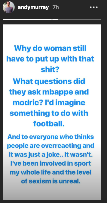 Quali domande hanno fatto a Mbappé e Modric? Immagino qualcosa che c'entri con il calcio. E a tutti quelli che pensano che io stia esagerando e che fosse solo uno scherzo...non lo era. Sono stato coinvolto nello sport per tutta la mia vita e il livello di sessismo è irreale.