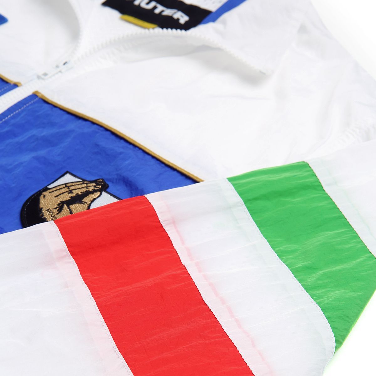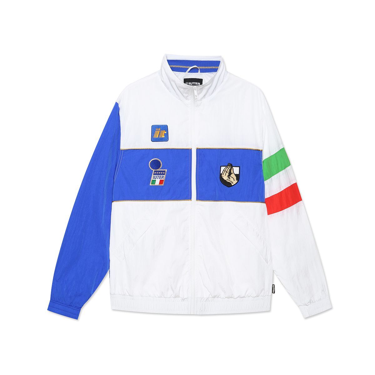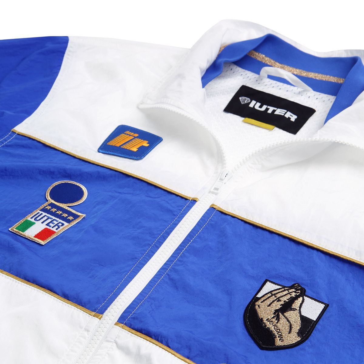 La capsule è completata con una tuta completa di track jacket e track pants, questi ultimi interamente Blu royal mentre la giacca riprende il modello utilizzato sempre nel '94 con il tricolore sulla manica destra. I bordi del colletto e della maniche in oro sono il dettaglio in più di questa collezione, pronta ad essere saccheggiata dai calcio e streetwear nostalgici. Saranno stati i giocatori leggendari di quella generazione, o forse il fascino di divise mai replicate con la stessa efficcacia, ma il calcio vintage continua a ispirare alcuni progetti molto interessanti, come quello di IUTER e No Kiddin!NYC.