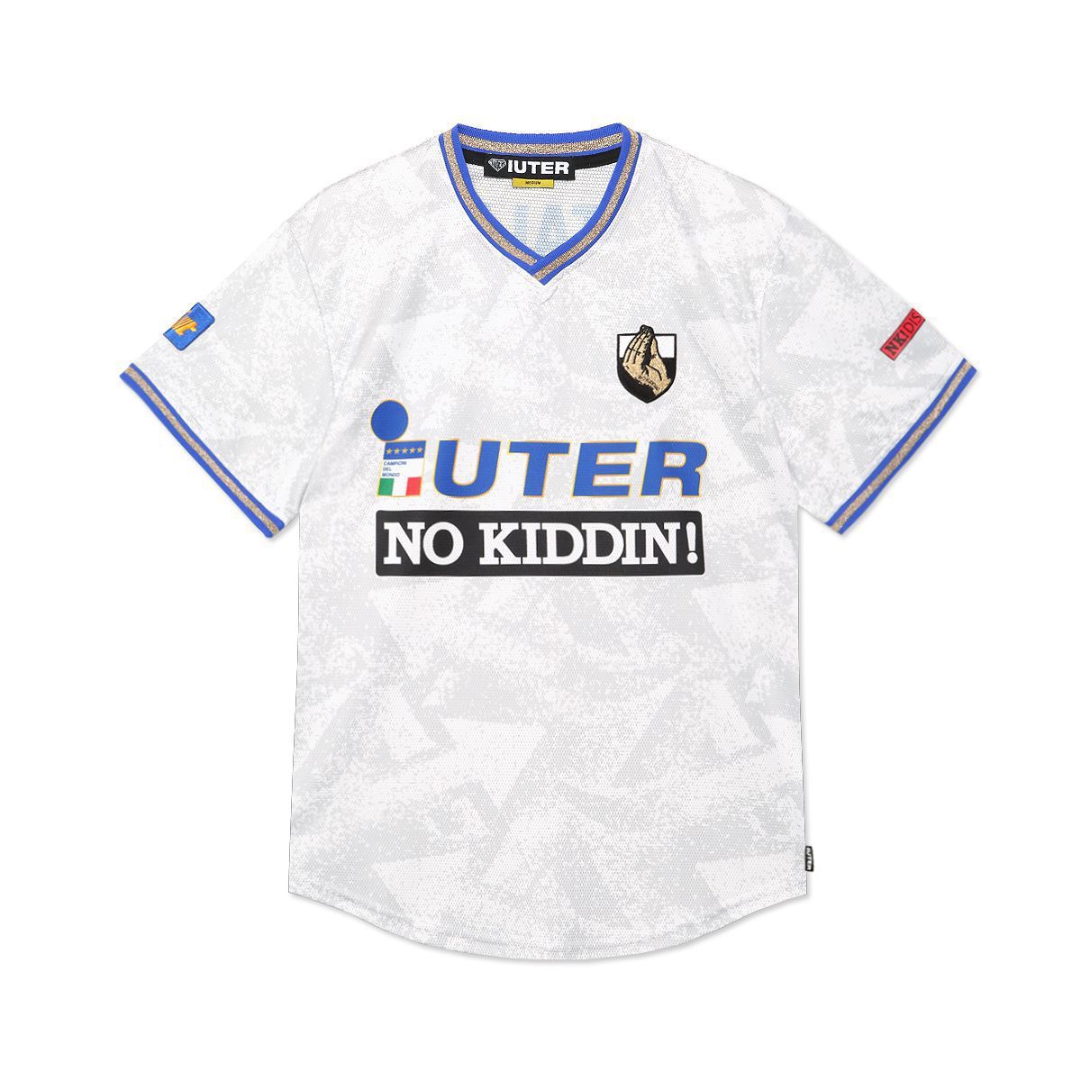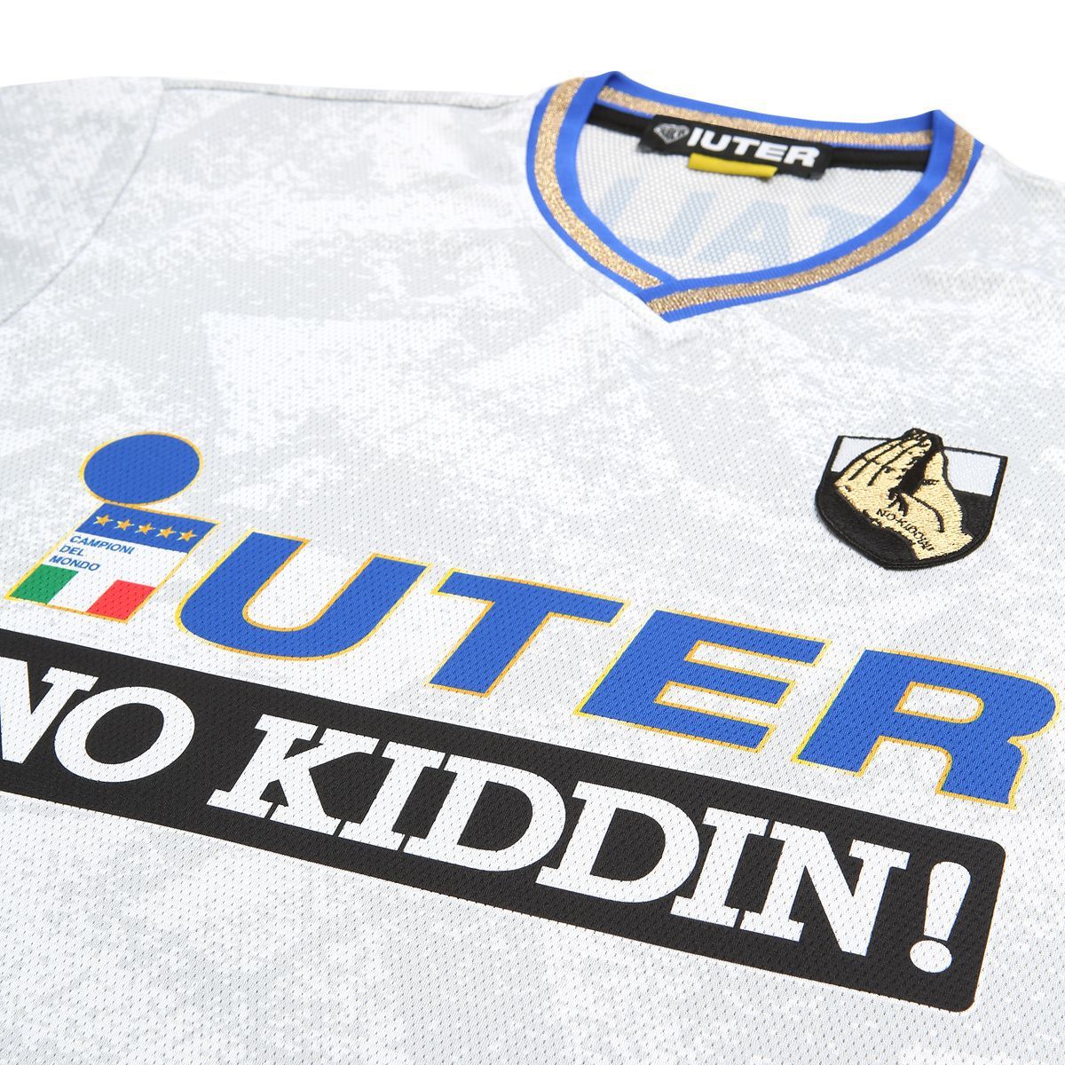 Il brand milanese IUTER ha presentato in collaborazione con No Kiddin! NYC una capsule football inspired, reinterpretando in chiave ironica una delle maglie dell'era d'oro del calcio italiano, quella del 1994 utilizzati durante i Mondiali persi in finale contro il Brasile.