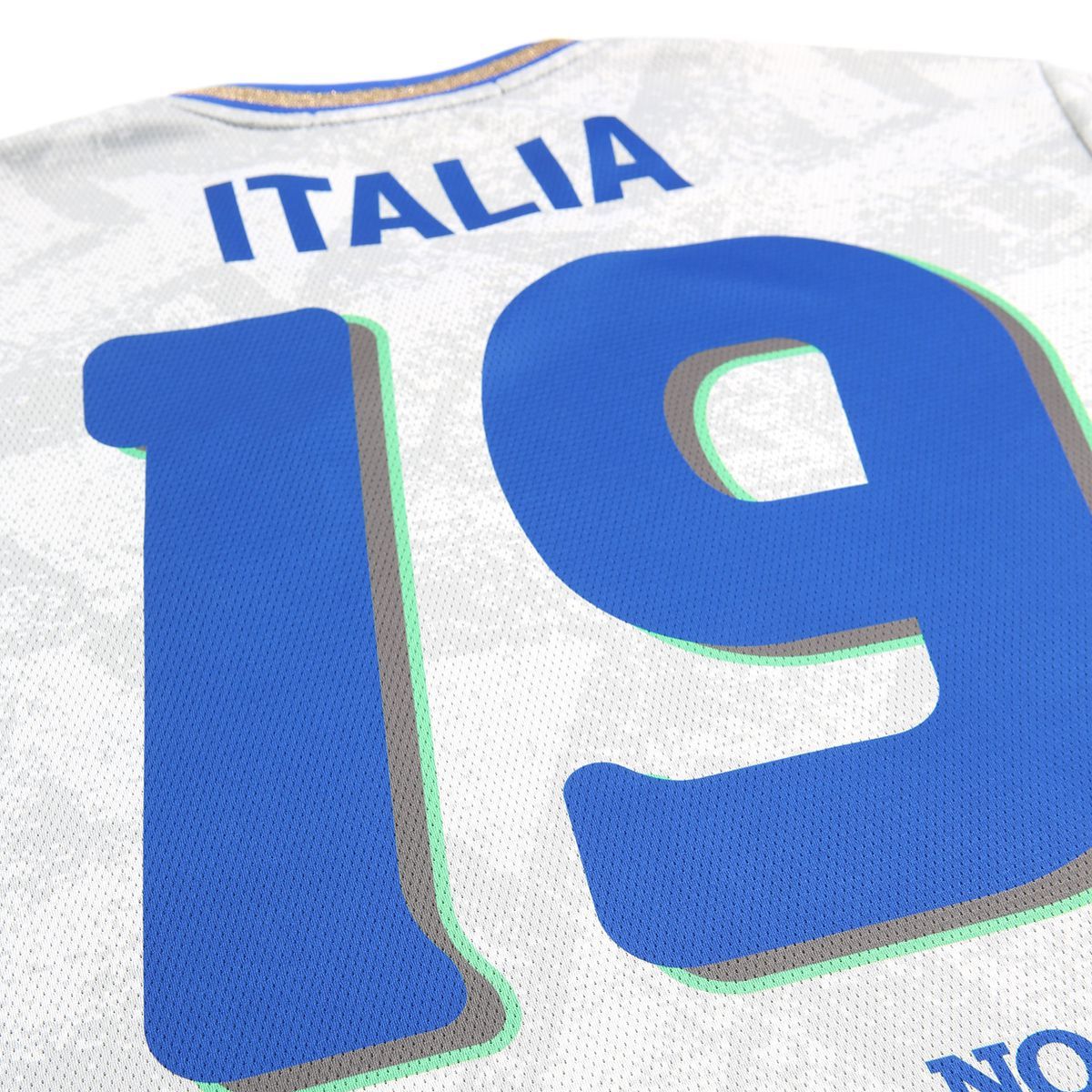 All'interno della maglia sono inseriti anche altri simboli utilizzati nelle divise e tute di quegli anni, come la patch dell'Italiana Petroli, storpiato in IT, oppure il crest della FIGC nel quale sono inserite 5 stelle e la scritta "campioni del mondo". Lo stemma sul petto è invece una rivisitazione di un vero e proprio marchio di fabbrica italiano, per una collaborazione italo-americana, che già in passato aveva presentato una jersey blu con il numero ispirato alle divise e ai numeri squadrati in 3D di inizio anni '90.