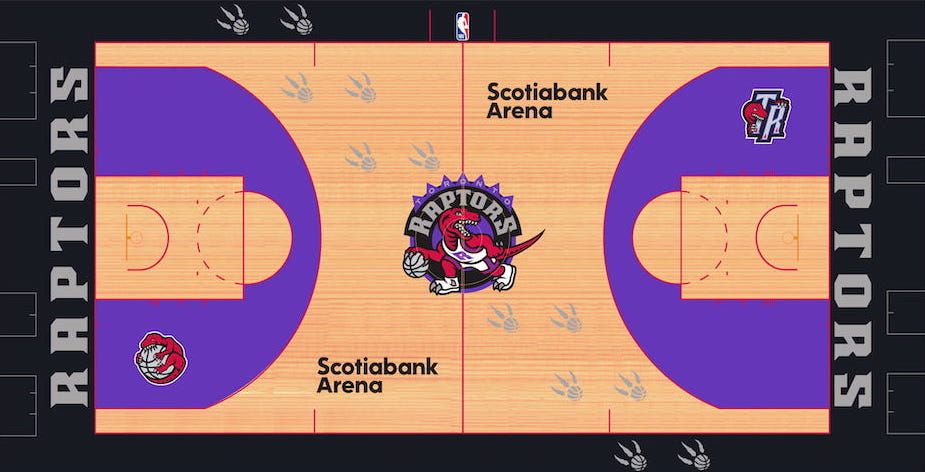 Per il secondo anno consecutivo i Raptors giocheranno alla Scotiabank Arena, dopo il cambio di nome rispetto alla storica Air Canada Centre. Una delle versioni che vedremo durante la stagione 2019/2020 propone dei colori inediti ma soprattutto il vecchio logo della franchigia canadese, quello con il Dino Jersey che comparirà pure sulle maglie da gioco dei campioni in carica. Ma forse la vera chicca sono le orme in mezzo al campo.