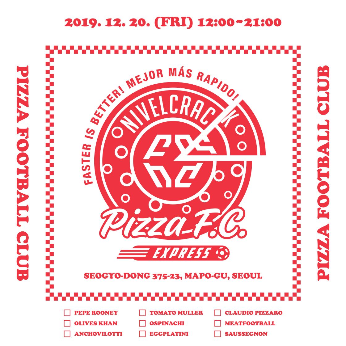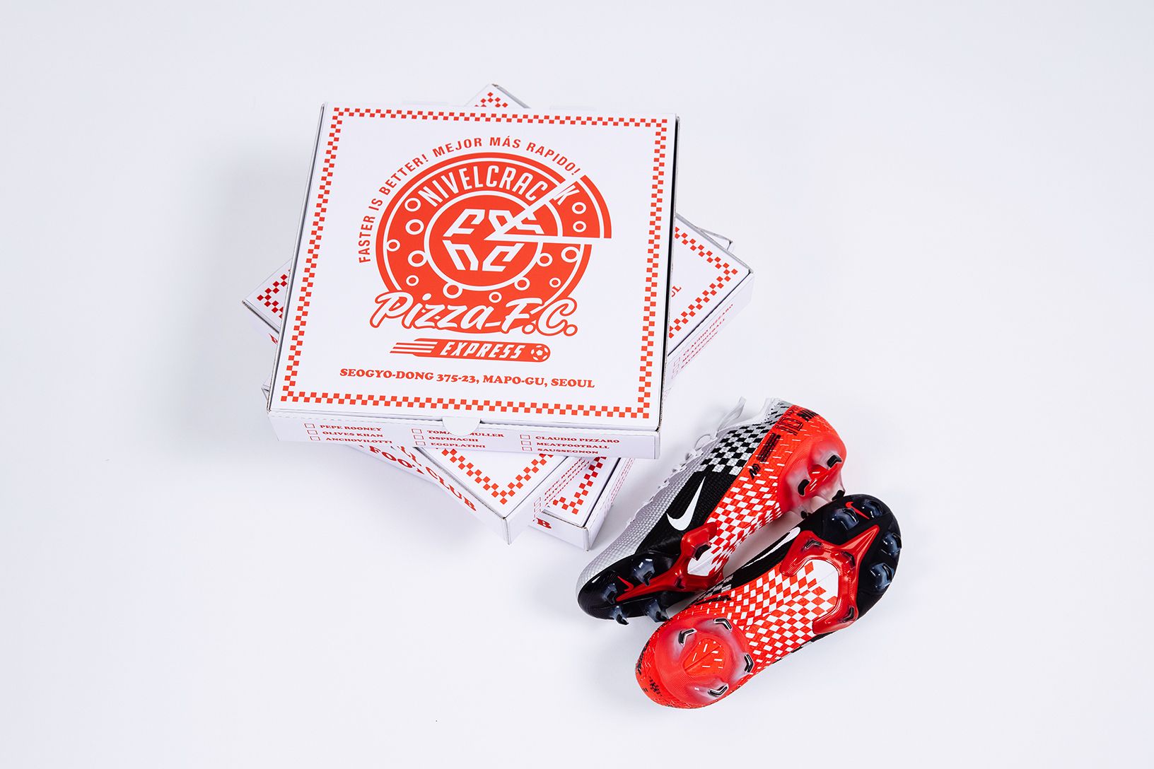 Dopo avere recentemente aperto il primo store a Seoul, il brand sudcoreano Nivelcrack ha collaborato con 'Slice Pizza Market', una pizzeria della capitale sudcoreana, per una collezione intitolata "Pizza FC". Il tema della collaborazione, che si basa sull'intersezione tra calcio e pizza, un cibo privilegiato per i pasti post partita, è una sorta di pizzeria fittizzia chiamata 'Pizza Football Club'. La collezione è composta da felpe con cappuccio, canotte, un marsupio a tracolla e dei calzini e sul cartone della pizza che contiene gli item compaiono i nomi 'fake' di alcuni giocatori famosi, rinominati come se fossero gusti di pizza (es. 'Pepe Rooney', 'Tomato Muller', 'Claudio Pizzaro').