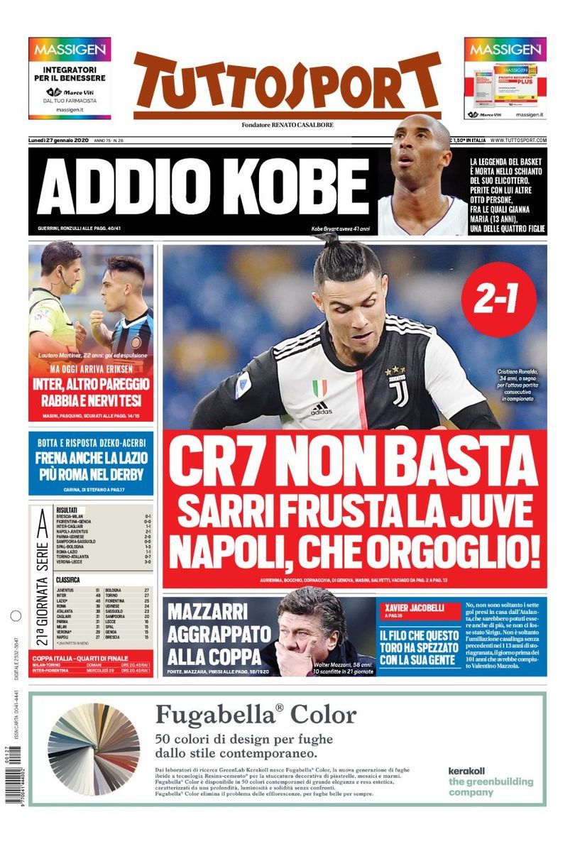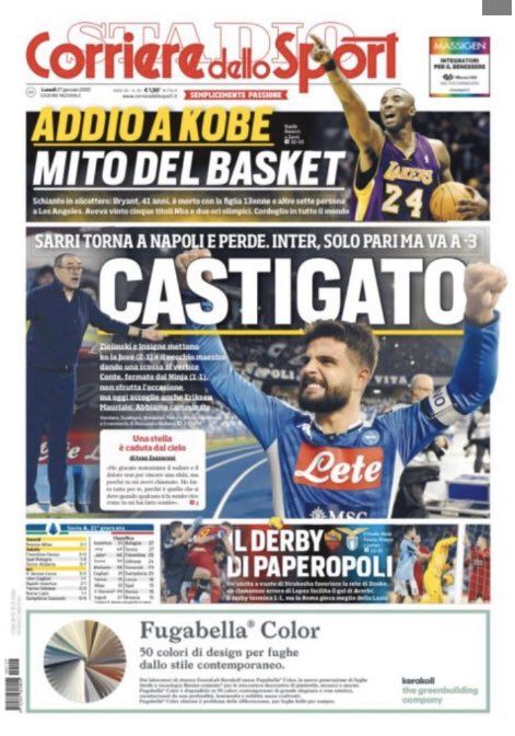 Su Twitter, in un thread ben presto degenerato nei modi e nei toni, Roberto Maida del Corriere dello Sport – che alla tragedia di Calabasas ha riservato il taglio alto in prima e due pagine di approfondimento dopo i servizi su Serie A, B, C e D. Una linea seguita anche da Tuttosport, mentre la Gazzetta dello Sport ha optato per una prima divisa tra Kobe e Napoli-Juve e le pagine dalla 2 alla 7 riservate agli articoli sul campione scomparso – fornisce una potenziale chiave di lettura, parlando di «una comunicazione diversa. Un lettorato diverso. Una cultura diversa» dell’estero in relazione alla priorità e al risalto da dare a un certo tipo di notizie rispetto allo sport nazionalpopolare per eccellenza. Si tratta di un modo per ribadire come una certa linea editoriale sia il frutto della volontà di dare al lettore e all’appassionato italiano quello che vuole: quindi calcio in primis, sempre e comunque, poi tutto il resto. Anche quando si tratta della morte improvvisa di una delle ultime icone globali, globalizzate e trasversali del nostro tempo. E pazienza che in Spagna – Paese affine per ciò che riguarda le centralità culturale del calcio e, quindi, per impostazione dei quotidiani di settore – prima della breaking news di TMZ era tutto pronto per la celebrazione della nazionale di pallamano campione d’Europa in Austria.