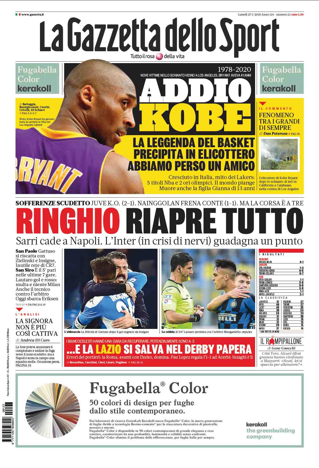 In un pezzo pubblicato sul terzo numero di Rivista Undici nell’aprile 2015, Simon Kuper riportava un passaggio del saggio 'Chiacchiera sportiva' di Umberto Eco in cui si sosteneva come oggi lo sport «consiste di una discussione della stampa sportiva, che genera a sua volta il discorso sulla stampa sportiva, e dunque uno sport elevato alla potenza n». La polemica, naturalmente a mezzo social, che si è sviluppata a seguito della scelta dei tre principali quotidiani sportivi italiani di non dedicare l’intera prima pagina di lunedì 27 gennaio a Kobe Bryant – a differenza di quanto fatto dagli omologhi stranieri come L’Equipe, Marca, AS, Sport – ha rilanciato non solo l’idea di un dibattito sportivo ormai sempre più staccato e indipendente dallo sport stesso, ma anche la ciclica discussione sul “calciocentrismo” talvolta esasperato (ed esasperante?) della stampa di settore, anche di fronte ad avvenimenti epocali, positivi o negativi che siano. Una percezione, tra l'altro, condivisa anche da Marco Belinelli e Federica Pellegrini – che su Instagram hanno usato toni poco concilianti – oltre che da Fabrizio Biasin e Massimiliano Ambesi, due tra i giornalisti sportivi italiani più social.
