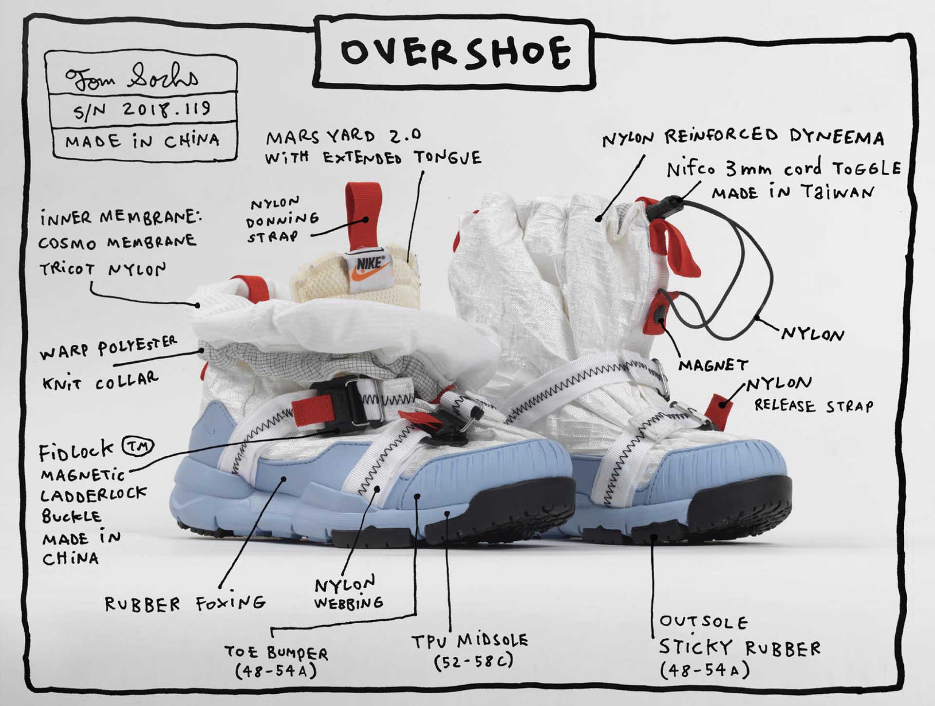 La collaborazione tra Tom Sachs e Nike per il progetto ''NIKECraft'' è stato senza alcun dubbio un lavoro avanguardistico che ha portato alla creazione di una sneakers (in due versioni), una overshoe, un ''exploding poncho'' ed uno shorts in piuma, tutti items caratterizzati dall'utilizzo di materiali come la Dyneema - una fibra super resistente utilizzata anche per le corde delle barche a vela - che potenzialmente isolerebbe dal freddo e dal bagnato.