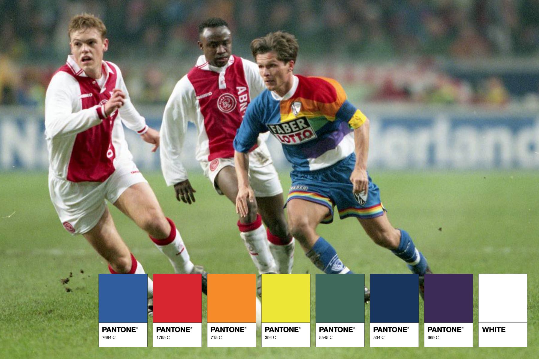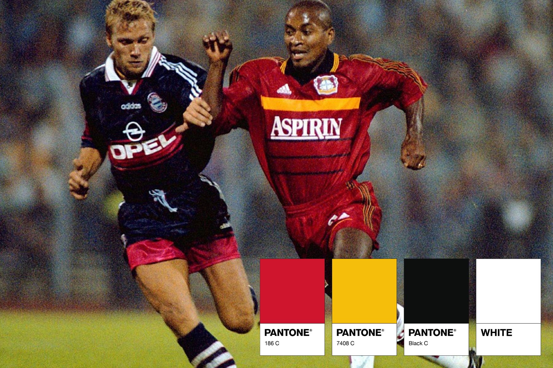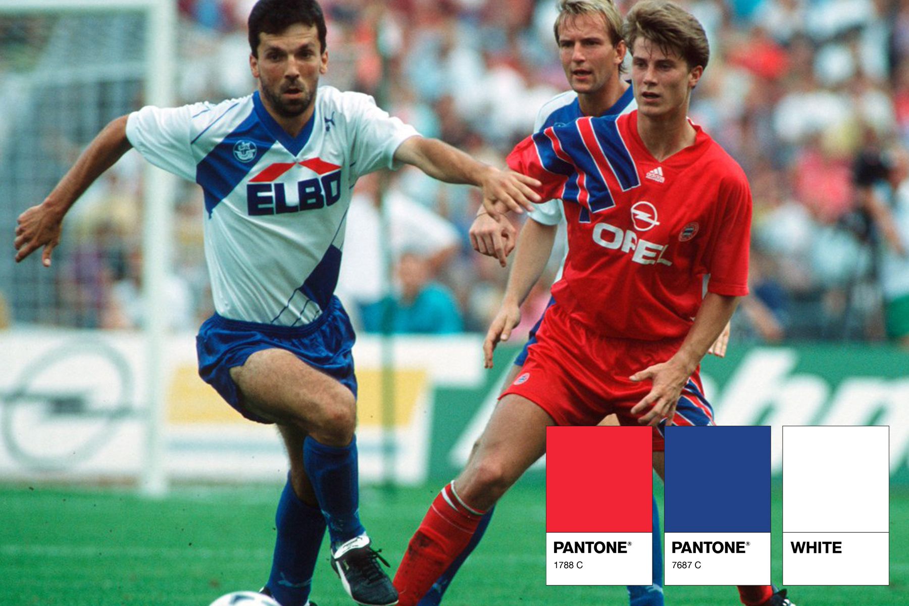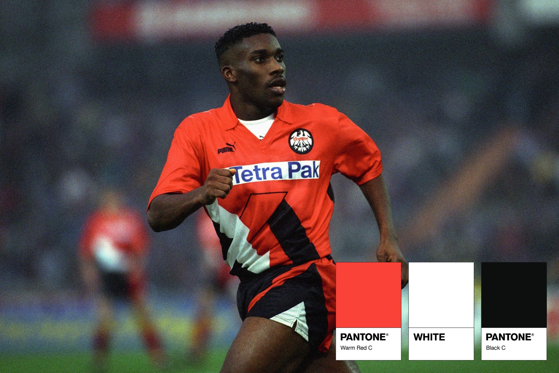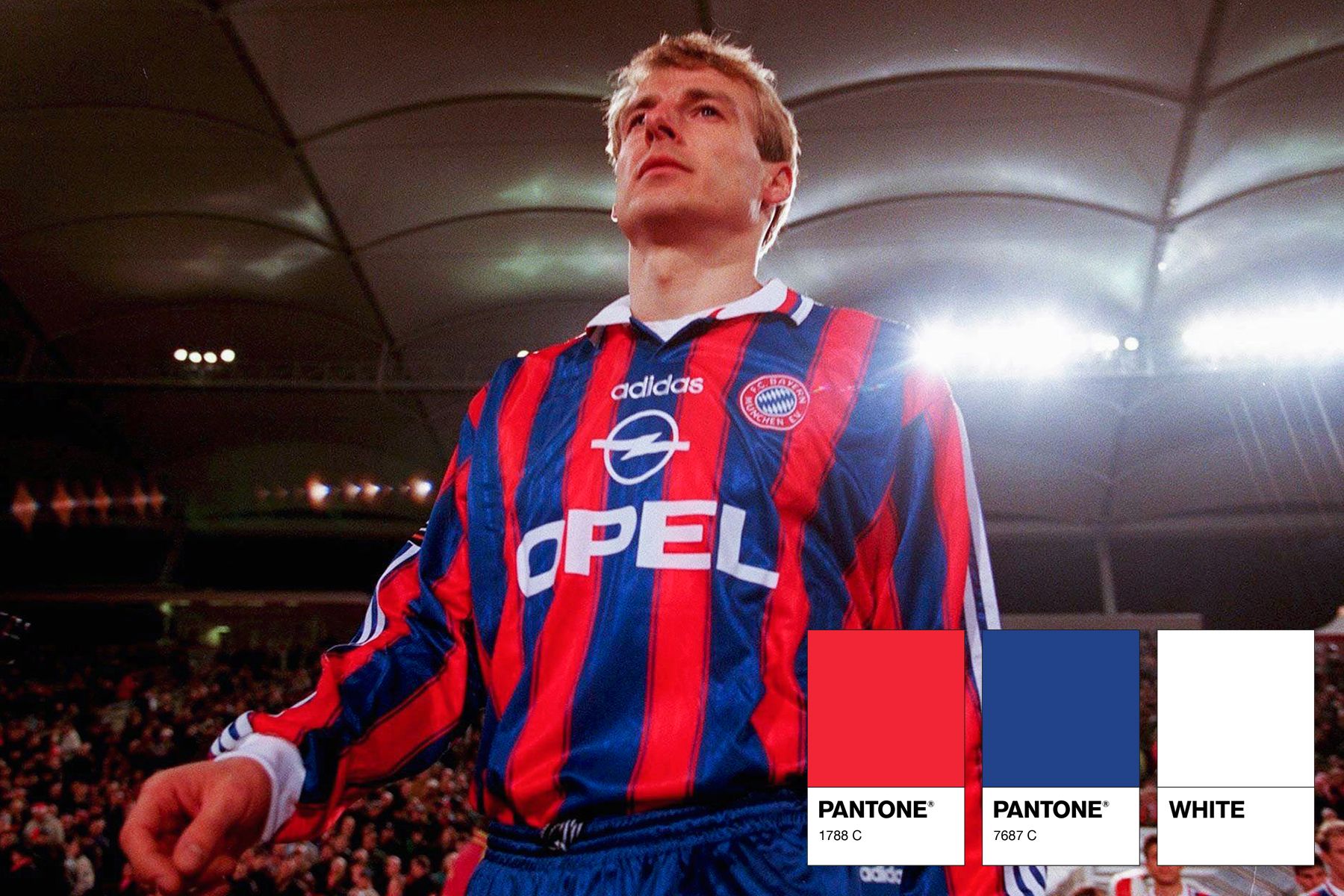 Kit 3: 1995-96, first kit; Pantone 3: 1788 C, 7687 C, White