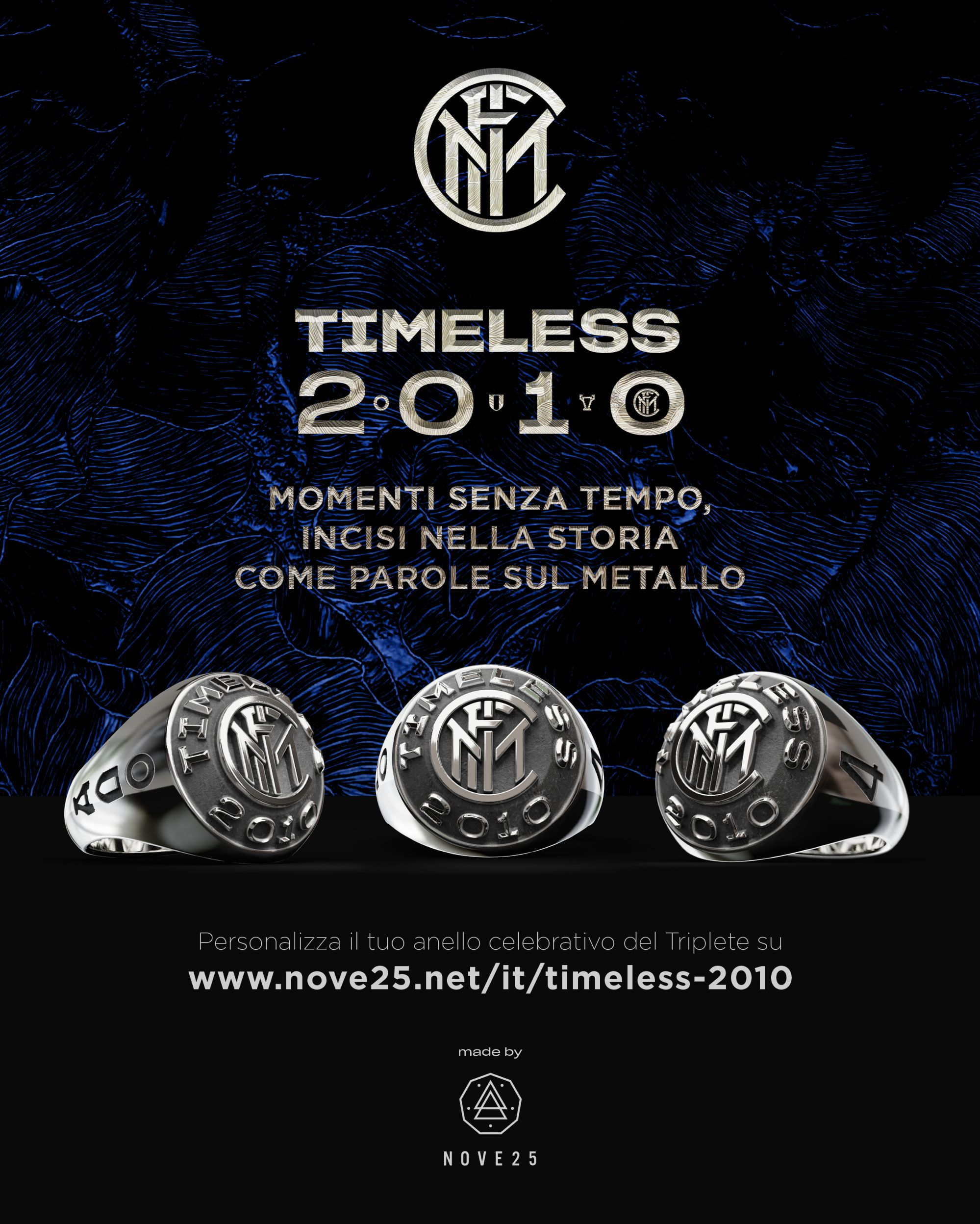 L'anello è stato realizzato per i membri della squadra della magica cavalcata della Champions 2010, ma è anche disponibile per i tifosi dell'Inter sul sito di Nove25, nella sezione #Timeless2010. L'anello è decorato con l'incisione del logo dell'Inter, della campagna e delle tre coppe che resero il mese di maggio di 10 anni fa un momento epico. Il numero di maglia è personalizzabile e ogni tifoso può far incidere sulla propria copia il numero che preferisce: il 22 dell'autore della doppietta, il 9 di Samuel Eto'o, il 10 di Sneijder, il 23 di Marco Materazzi o il 4 del capitan Javier Zanetti. Un pezzo da collezione realizzato interamente in Argento Sterling 925% con finitura brunita lucida, progettato e lavorato con tecnologie avanzate e rifinito a mano dai migliori esperti milanesi per garantirne il massimo dettaglio e una qualità elevata.