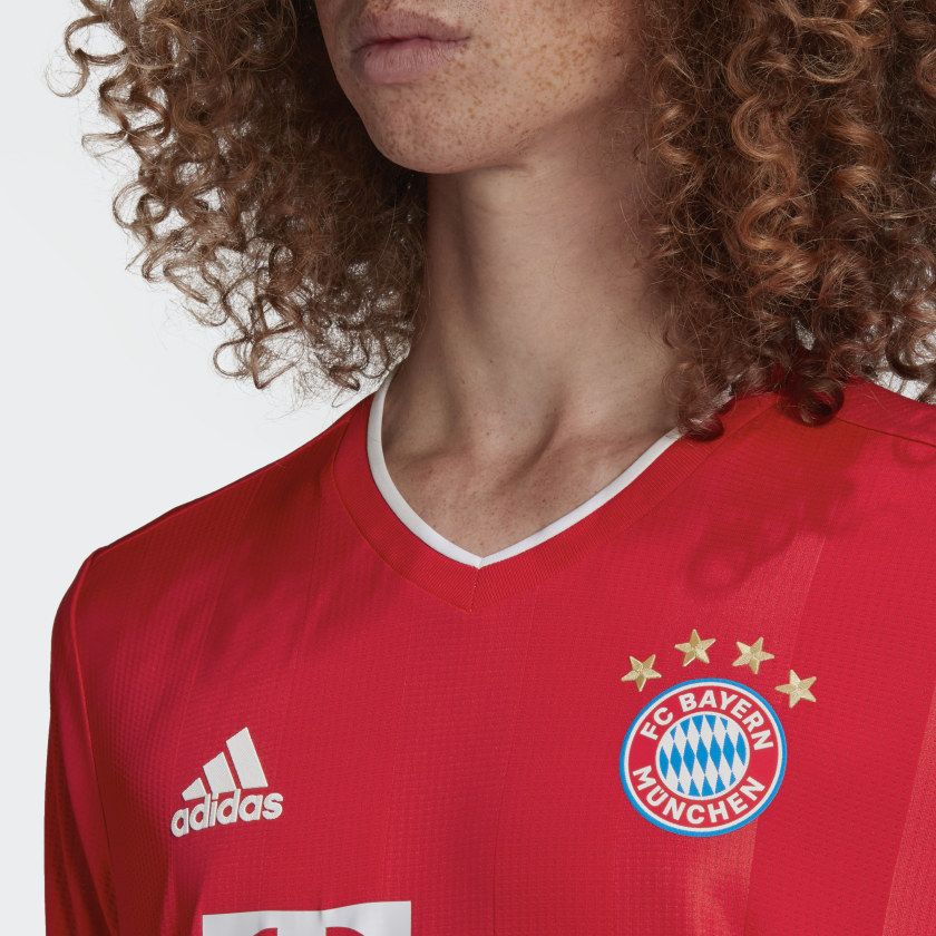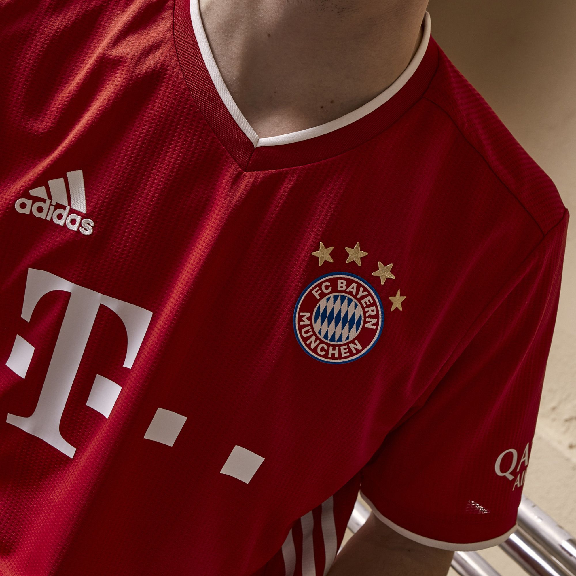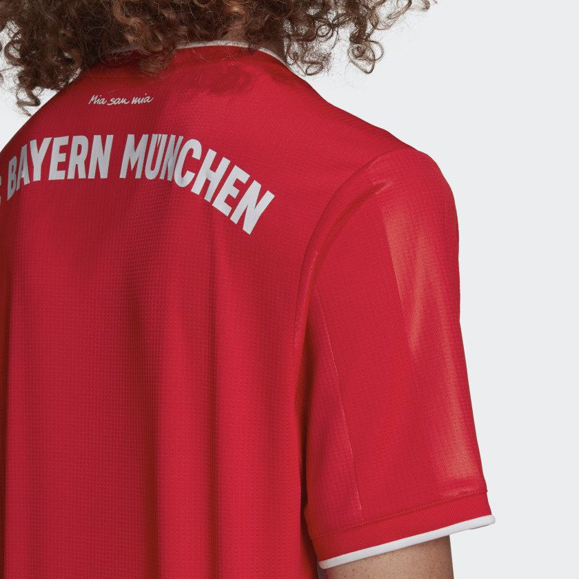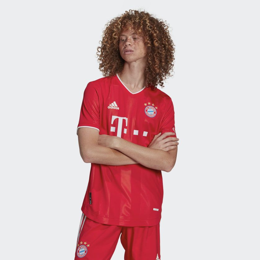 Dopo la stampa ispirata all'Allianz Arena di questa stagione, la maglia da casa Bayern Monaco '20-'21 presenta un sottile motivo jacquard con strisce composte da piccoli punti. Le three-stripes sono ancora presente su tutto il fianco della maglia,che ha anche un semplice collo a V con profilo bianco. A differenza della scorsa stagione invece pantaloncini e calze avranno una base completamente rossa, con dettagli in bianco.
