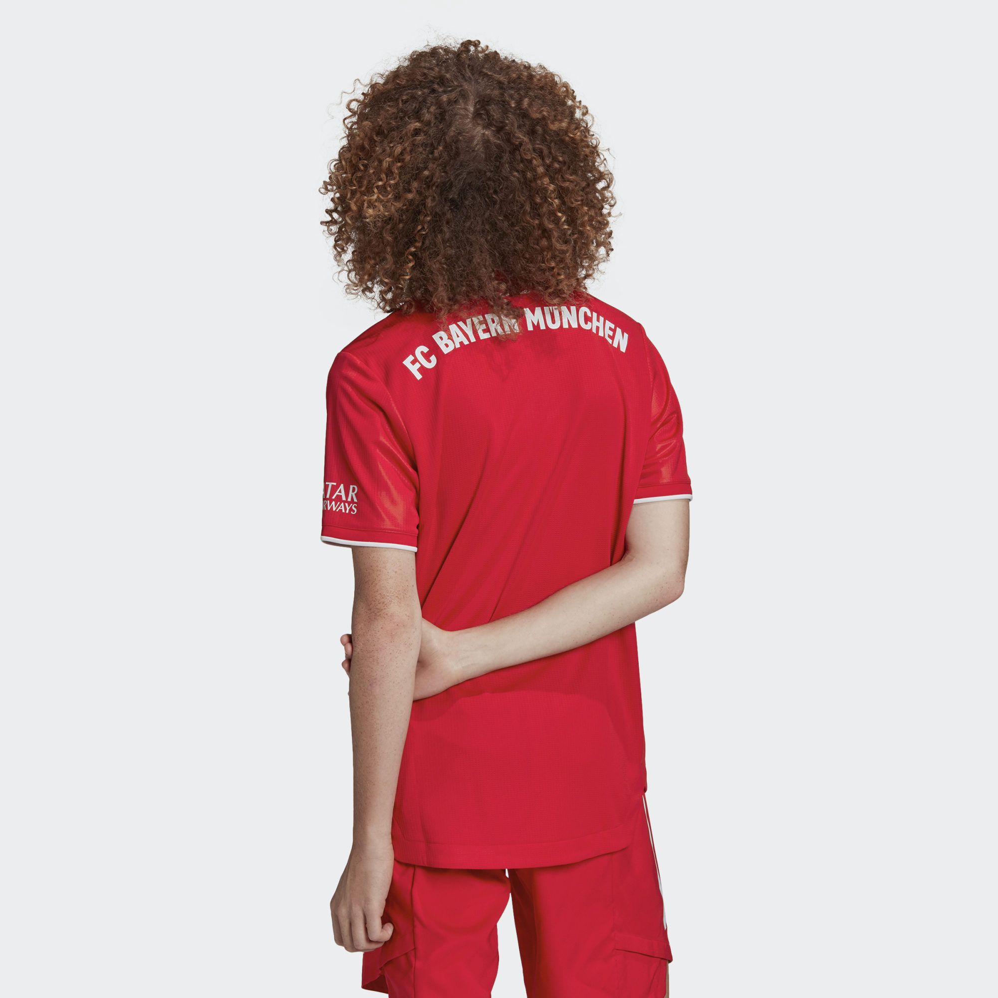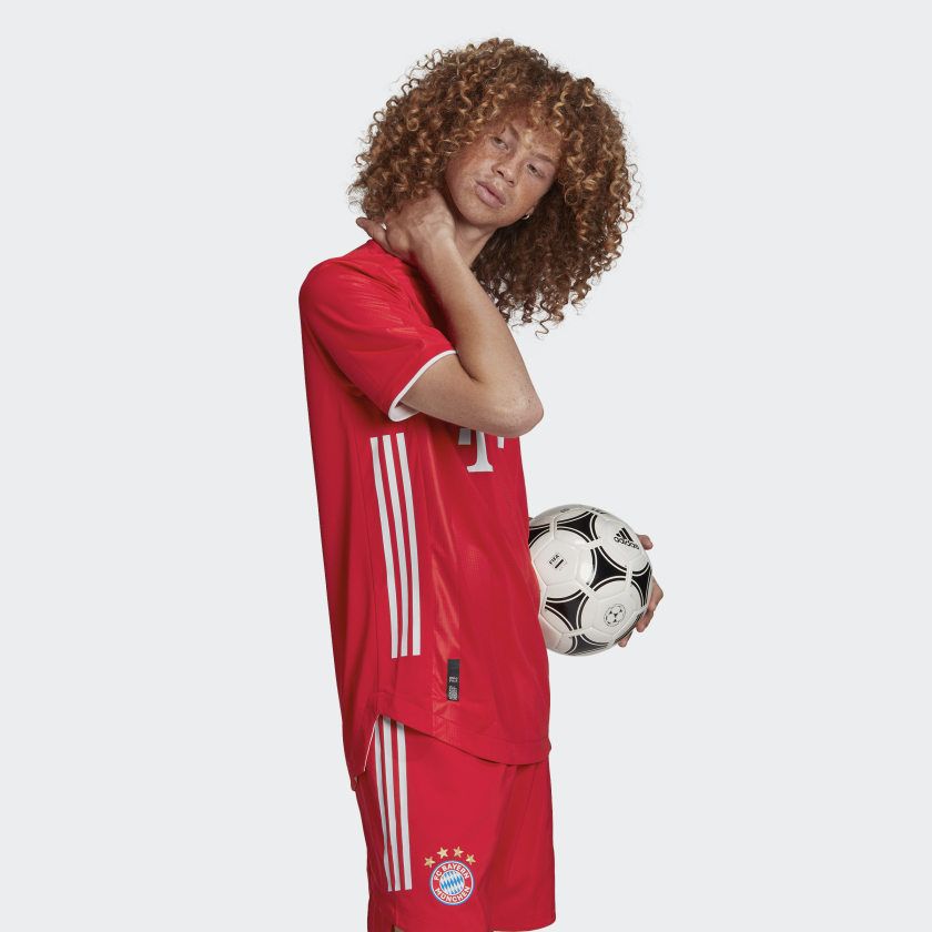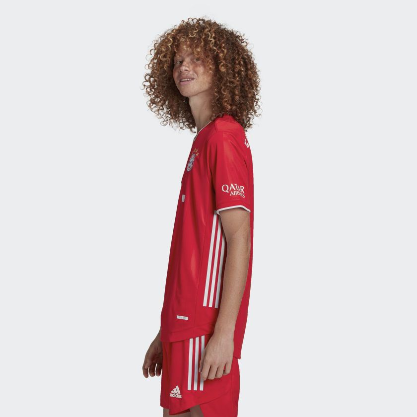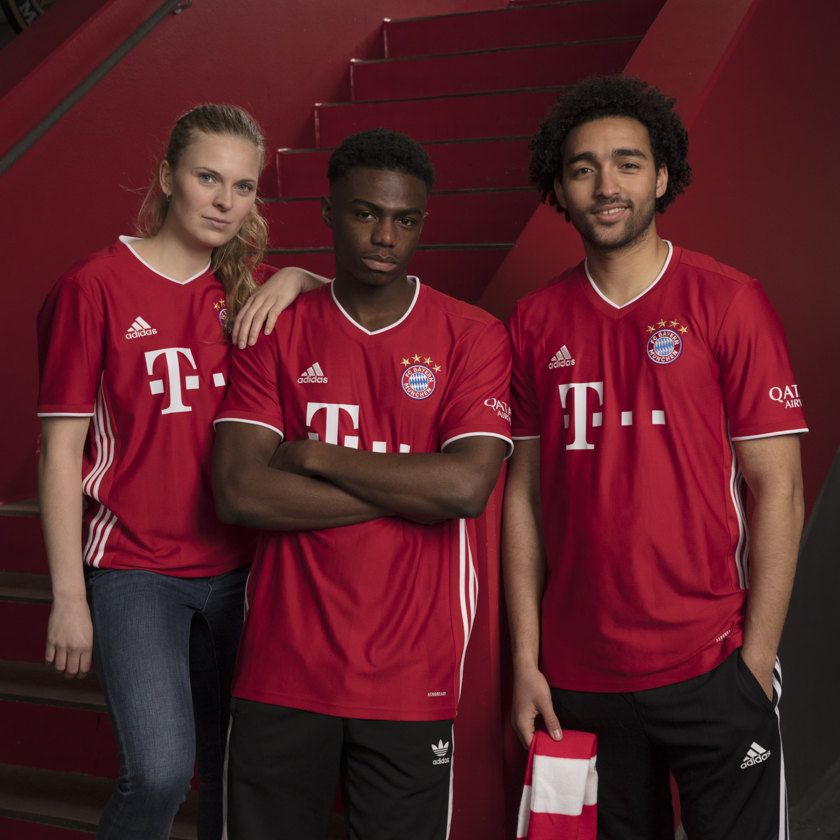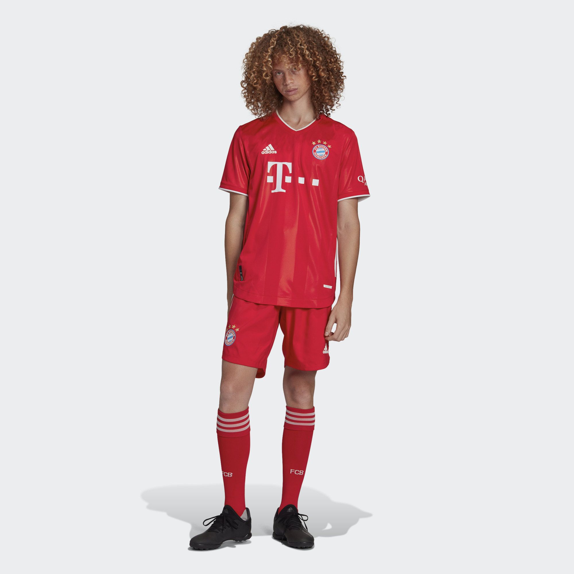 Dopo la stampa ispirata all'Allianz Arena di questa stagione, la maglia da casa Bayern Monaco '20-'21 presenta un sottile motivo jacquard con strisce composte da piccoli punti. Le three-stripes sono ancora presente su tutto il fianco della maglia,che ha anche un semplice collo a V con profilo bianco. A differenza della scorsa stagione invece pantaloncini e calze avranno una base completamente rossa, con dettagli in bianco.