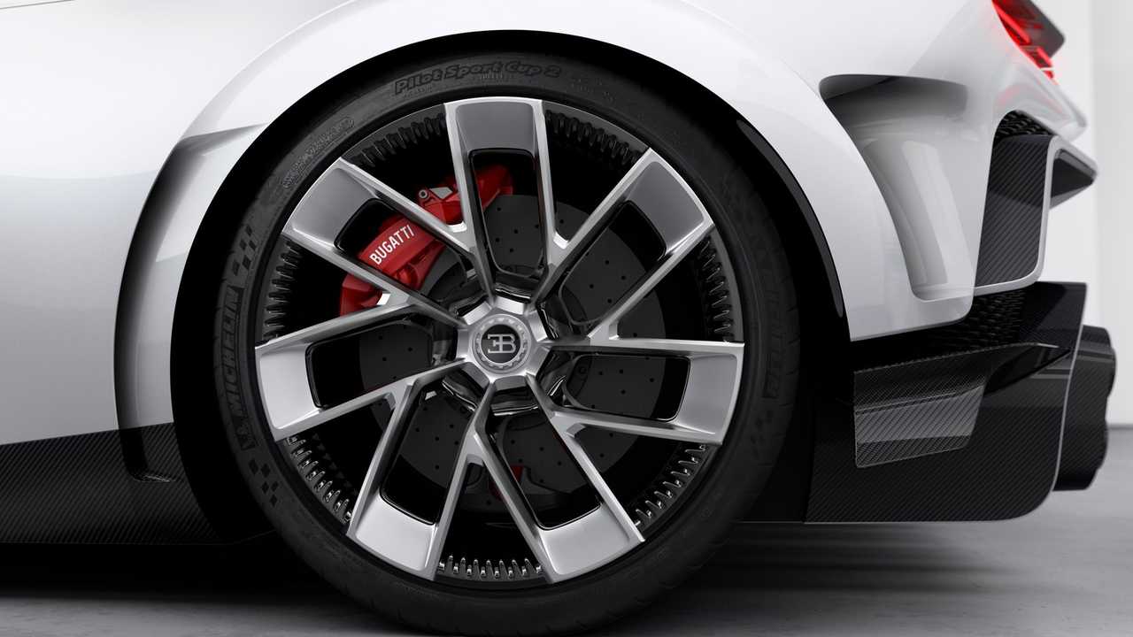 La vettura è stata totalmente stravolta sia nel telaio sia nella carrozzeria, con uno stile a cuneo. In linea generale la vettura presenta linee più squadrate rispetto alla Chiron, con svariati elementi che richiamano la vecchia EB110 come il frontale con i fari sottili e la tipica presa d’aria centrale a ferro di cavallo che è più piccola, nelle fiancate con la presa d'aria a 5 cerchi posizionata dietro i finestrini che richiamano quelle della EB110 SS, alettone nero fisso con regolazione meccanica e i fari a LED che richiamano la griglia d’aerazione della EB110.