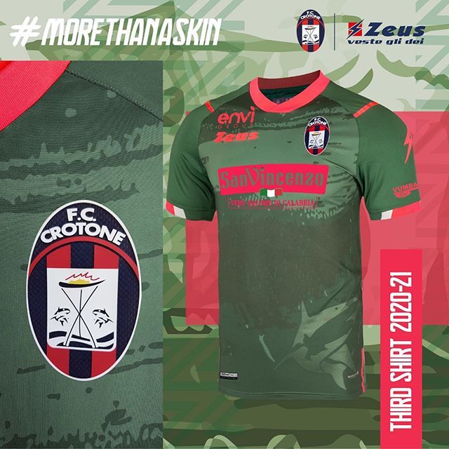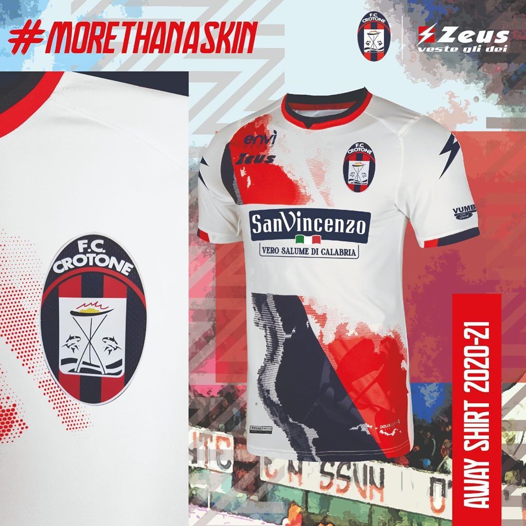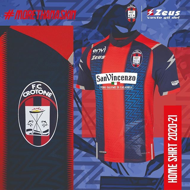 Il Crotone per la quindicesima stagione è brandizzato Zeus, un marchio campano che aveva già vestito il club calabrese nelle altre due stagioni di Serie A. Anche in questo caso, Zeus ha rispettato gli standard dei colori sociali, presentando la prima, classica con le strisce blu e rosse - con dei tratti zigzagati nelle strisce -, la seconda bianca e la terza verde. Zeus ha voluto sperimentare parecchio con questi tre kit, creando dei riferimenti al club e alla storia della città: sulla seconda, il pattern ha una striscia obliqua rossa e blu tagliata nettamente al centro dal quadrato bianco del main sponsor San Vincenzo. La striscia però è molto sfumata e con dei contorni indefiniti, un pattern che rimanda ai fumogeni e alle coreografie della curva dell'Ezio Scida. La terza anche presenta delle sfumature di verde chiaro sul pantone verde scuro del template, con bordi, colletto e sponsor colorati di rosa: la texture "erosa" è un riferimento alle rovine del tempio di Hera Lacina di Crotone. Inoltre, su tutte e tre le maglie, in basso a sinistra, c'è disegnato il rilievo di uno squalo, simbolo del Crotone.