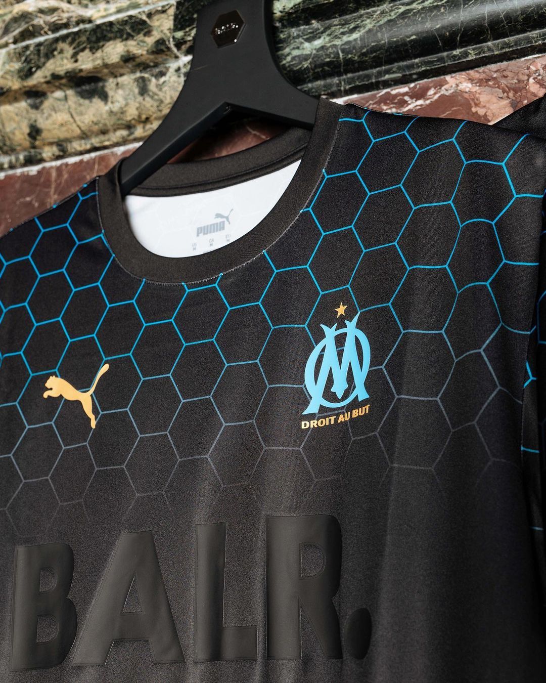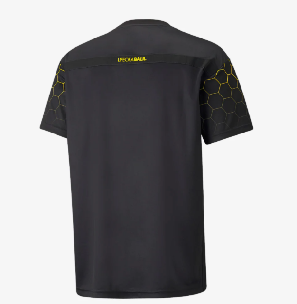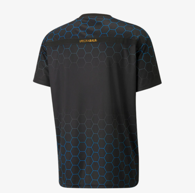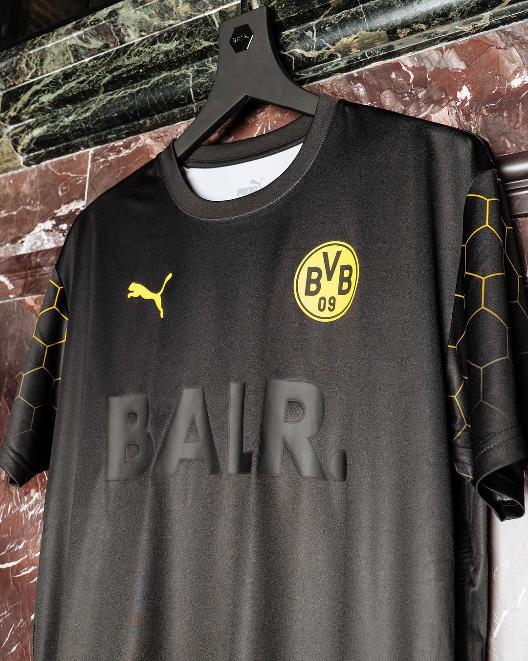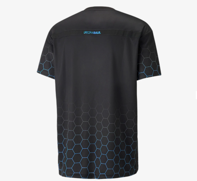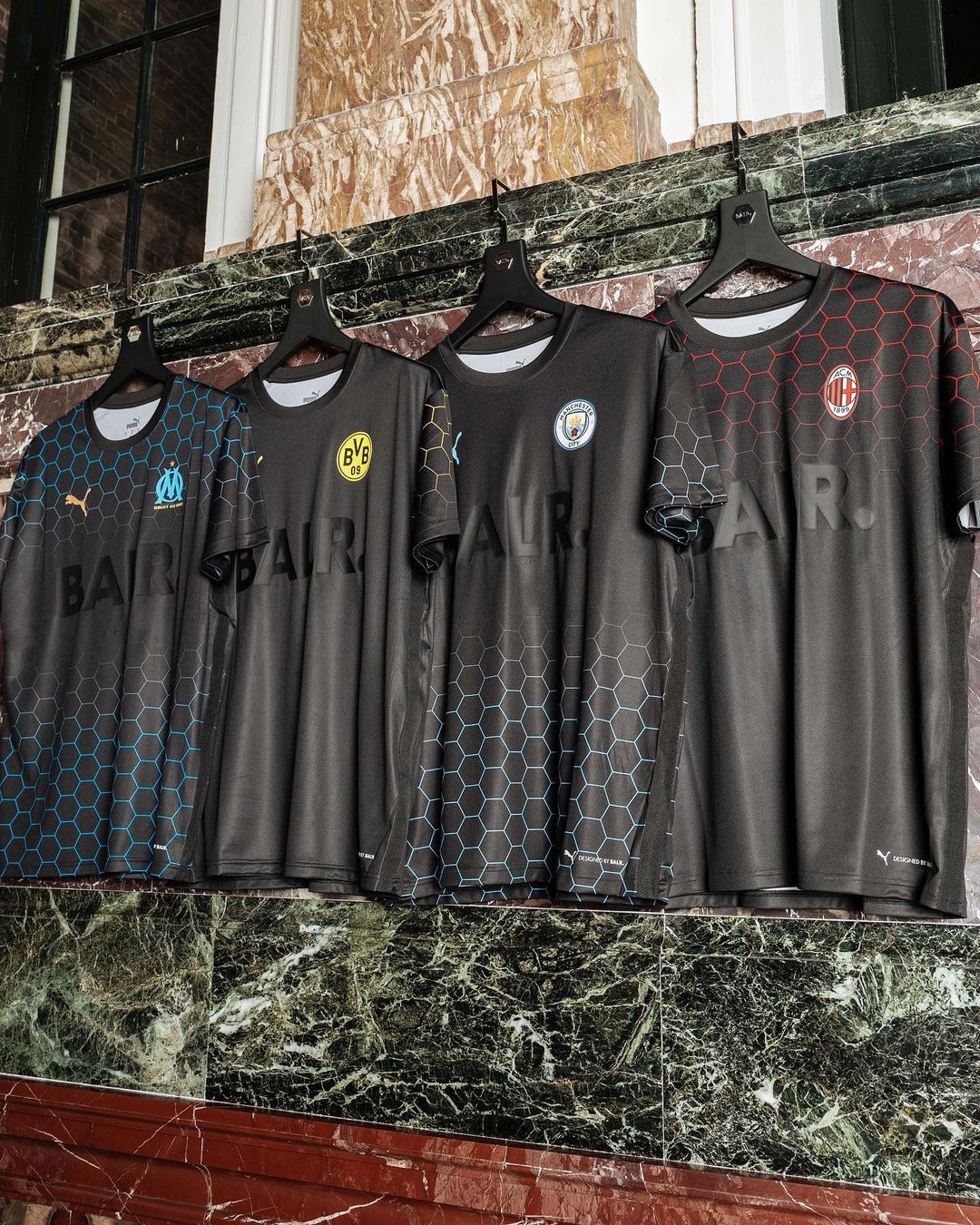 Le maglie hanno lo stesso pattern e un template minimamente differente, che separa le quattro versioni in base ai colori dei club. La divisa ha infatti degli esagoni dai colori sfumati in alcune zone del pattern, e la tonalità del colore dipende dal club di riferimento - giallo per il Dortmund, rosso per il Milan, azzurro per il Marsiglia e celeste chiaro per i Citizens. Anche lo stemma di PUMA cambia in base al colore del club, ma solo l'OM ce l'ha diverso - in oro. Tra l'altro, quella dei francesi è la maglia più elaborata, con la fascia d'esagoni sia sopra che sotto e che, come anche nelle altre tre versioni, compaiono sulle maniche. Come nell'ultima collezione prodotta da BALR. e PUMA, il brand olandese fa da sponsor alla maglia con il proprio logo al centro della divisa. La maglia del Dortmund invece ha gli esagoni solo sulle maniche e davanti e dietro è praticamente total black. Quella del Milan, invece, rimane molto sfumata, con gli esagoni solo nella parte superiore della maglia.