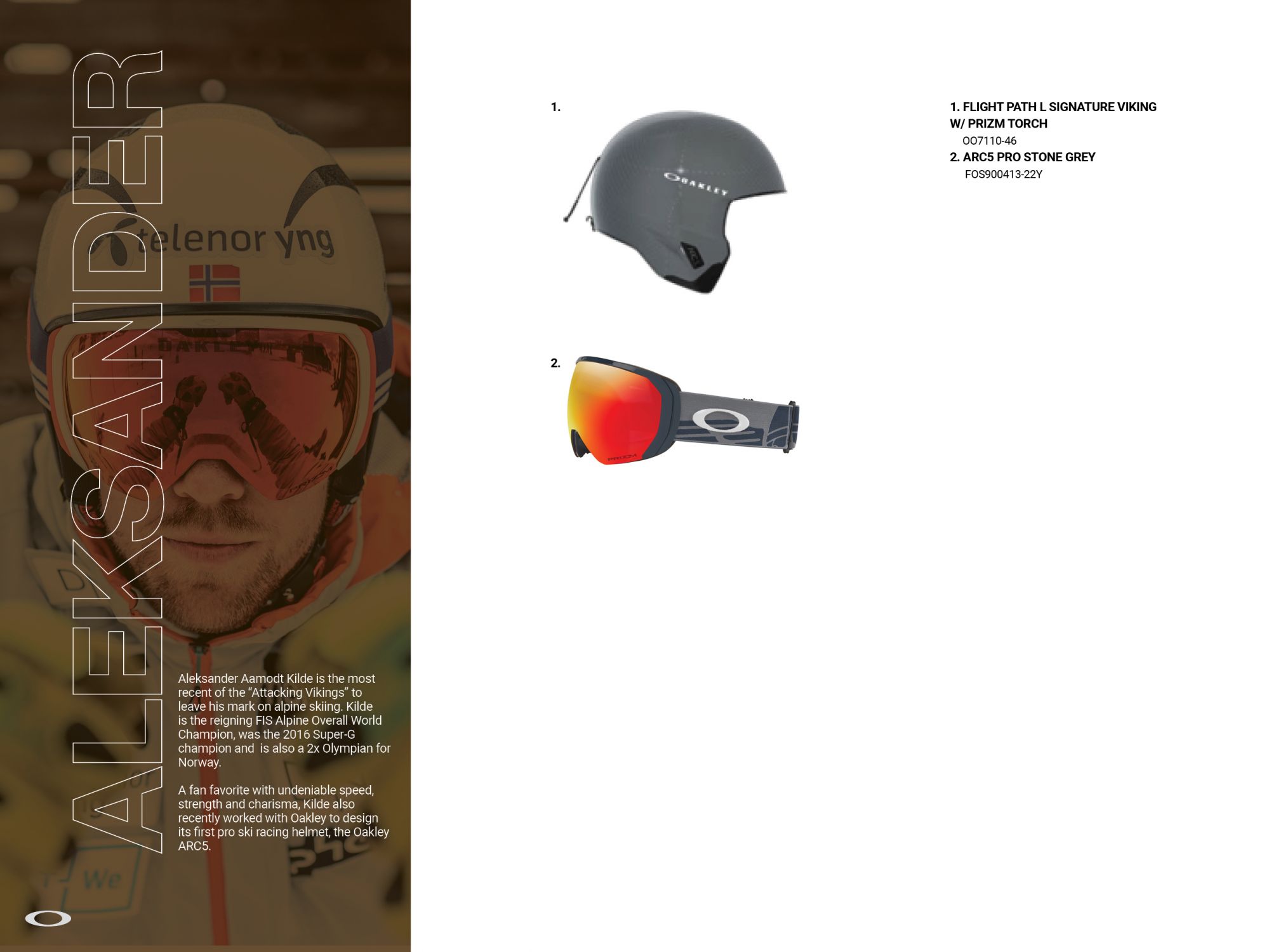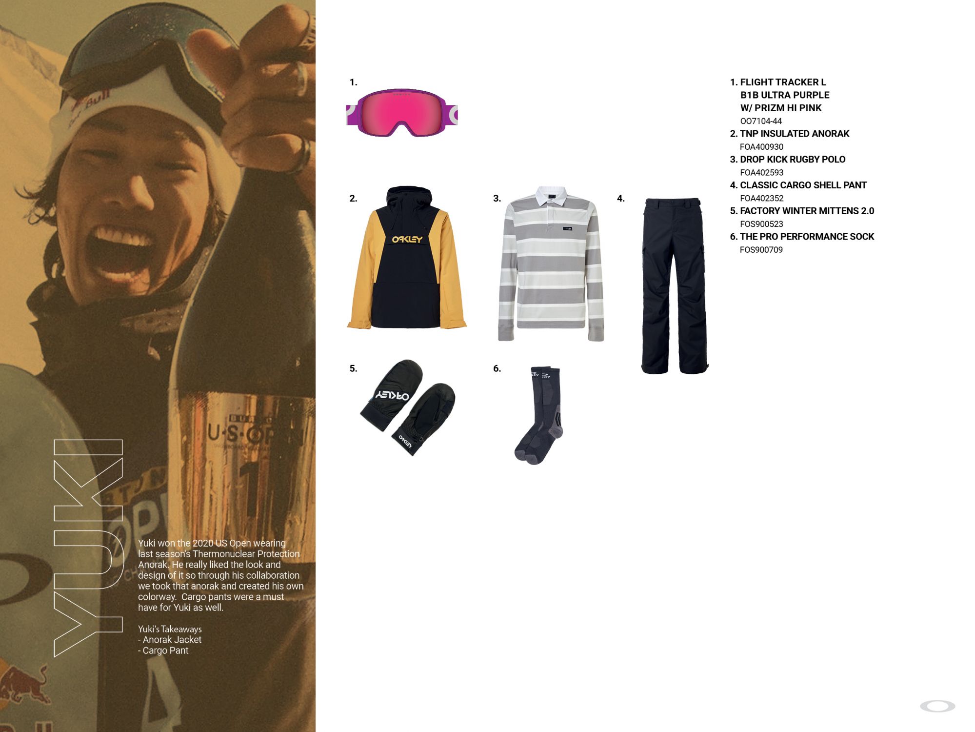 Per Yuki Kandono, snowboarder con due vittorie agli U.S. Open nel 2015 e 2020), ci sono un paio di pantaloni cargo e il parka Thermonuclear Protection, quello con cui ha vinto il torneo americano nel 2020 e che Oakley ha rivisitato per questa edizione Snow. Infine Aleksander Aamodt Kilde, campione in carica della Coppa del Mondo di scii alpino, per cui Oakley ha progettato (in collaborazione con lui, come per tutti gli altri) un esclusivo casco da scii professionale, l'ARC5 PRO.